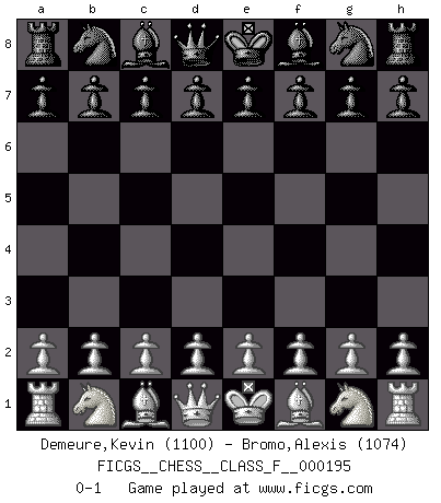Last move : 0-1 2018 March 22 18:8:43 [Event "FICGS__CHESS__CLASS_F__000195"] [Site "FICGS"] [Date "2018.02.10"] [Round "1"] [White "Demeure,Kevin"] [Black "Bromo,Alexis"] [Result "0-1"] [WhiteElo "1100"] [BlackElo "1074"] 0-1 This chess game has been lost on time (started : 2018.02.10 15:18:38) Player Black won this chess game. Follow this game move after move (download)When asked, -How is that you pick better moves than your opponents?, I responded: I'm very glad you asked me that, because, as it happens, there is a very simple answer. I think up my own moves, and I make my opponent think up his. (Alexander Alekhine) Es ist schade, dass viele Schachsportler vergessen, wie wichtig Auftreten und angemessene Kleidung sind. (Alexandra Kosteniuk) Un mal día en el Ajedrez, es mejor que cualquier buen día en el trabajo. (Anonymous) A ce moment-là, je menaçais de comprendre la position ! (Clément L'Heureux) The only difference between a tax man and a taxidermist is that the taxidermist leaves the skin. (Mark Twain)