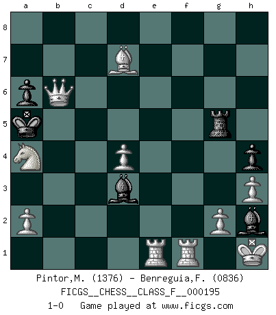 Last move : 1-0 2018 March 2 16:22:33 [Event "FICGS__CHESS__CLASS_F__000195"] [Site "FICGS"] [Date "2018.02.10"] [Round "1"] [White "Pintor,Manuel"] [Black "Benreguia,Frederic"] [Result "1-0"] [WhiteElo "1376"] [BlackElo "0836"] 1.e4 e5 2.f4 d6 3.Nf3 exf4 4.Bc4 g5 5.O-O Bg4 6.d4 Nf6 7.Bxf7+ Ke7 8.Nc3 h5 9.Bb3 h4 10.h3 Bh5 11.Qd3 Kd7 12.Nxg5 Qe7 13.Bxf4 Bg6 14.Qb5+ Kc8 15.e5 dxe5 16.Bxe5 c6 17.Qe2 Nfd7 18.Be6 Rh5 19.Bf6 Qe8 20.Rae1 Kc7 21.Be5+ Nxe5 22.Qxe5+ Bd6 23.Qg7+ Kb6 24.Na4+ Ka5 25.Qxb7 Na6 26.Bd7 Qb8 27.Qxc6 Rxg5 28.c3 Bh2+ 29.Kh1 Bd3 30.b4+ Nxb4 31.cxb4+ Qxb4 32.Qxa8 a6 33.Qd8+ Qb6 34.Qxb6+ 1-0 King's gambit Kingside Castling by player White (move 5) Player White won this chess game. Follow this game move after move (download)The hardest game to win is a won game. (Emanuel Lasker) Ja, ich habe einmal eine Blitzpartie gespielt, es war in einem Zug, 1929. --im Interview 1989 (Mikhail Moiseyevich Botvinik) Una compensación adecuada por un sacrificio es tener una combinación sólida que conduce a una posición ganadora; una compensación adecuada por una metida de pata es dejar a tu oponente arrebatar una derrota de las fauces de la victoria. (Bruce A. Moon) Aux échecs, l'amour-propre est satisfait quand on remporte la victoire, mais il n'y a pas de honte à être battu. (Benjamin Franklin) The modern world has divided itself into Conservatives and Progressives. The business of Progressives is to go on making mistakes. The business of the Conservatives is to prevent the mistakes from being corrected. (G.K. Chesterton)