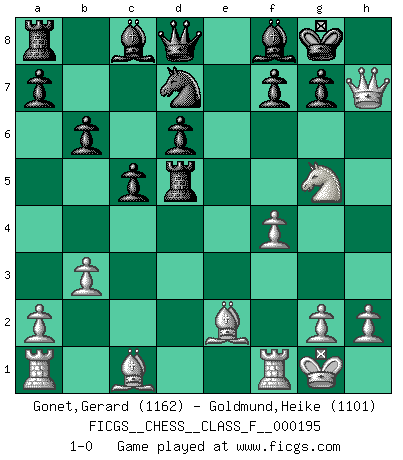 Last move : 1-0 2018 February 26 20:37:28 [Event "FICGS__CHESS__CLASS_F__000195"] [Site "FICGS"] [Date "2018.02.10"] [Round "1"] [White "Gonet,Gerard"] [Black "Goldmund,Heike"] [Result "1-0"] [WhiteElo "1162"] [BlackElo "1101"] 1.d4 Nf6 2.f3 e6 3.e4 c5 4.d5 b6 5.c4 d6 6.Nc3 Be7 7.Be2 O-O 8.f4 exd5 9.cxd5 Nbd7 10.Nf3 Re8 11.O-O Bf8 12.b3 Nxe4 13.Nxe4 Rxe4 14.Ng5 Rd4 15.Qc2 Rxd5 16.Qxh7+ 1-0 Paleface attack Kingside Castling by player Black (move 7) Kingside Castling by player White (move 11) Player White won this chess game. Follow this game move after move (download)Chess is as much a mystery as women. (Purdy) Drei Punkte vor allen anderen ist wie einer, der im weißen Anzug posiert, während der Rest in Müllsäcke gekleidet dasteht. (Viktor Kortschnoi) No es suficiente ser un buen jugador, se debe también de jugar bién. (Siegbert Tarrasch) Pour moi, les échecs ne sont pas un jeu mais un art. (Alexandre Alekhine) You think that education is too expensive ? Try ignorance. (Derek Bok)