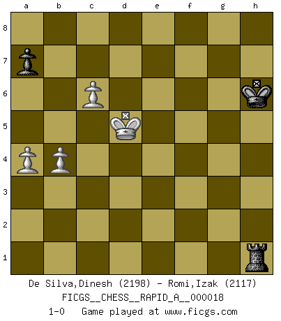 Last move : 1-0 2007 September 15 15:19:39 [Event "FICGS__CHESS__RAPID_A__000018"] [Site "FICGS"] [Date "2007.04.23"] [Round "1"] [White "De Silva,Dinesh"] [Black "Romi,Izak"] [Result "1-0"] [WhiteElo "2198"] [BlackElo "2117"] 1.e4 c5 2.Nf3 d6 3.d4 cxd4 4.Nxd4 Nf6 5.Nc3 g6 6.Be3 Bg7 7.f3 O-O 8.Qd2 Nc6 9.O-O-O d5 10.exd5 Nxd5 11.Nxc6 bxc6 12.Bd4 Bxd4 13.Qxd4 Qc7 14.Bc4 e5 15.Qd2 Be6 16.Ne4 f6 17.h4 Rad8 18.h5 g5 19.h6 Kh8 20.Qf2 Qe7 21.Qc5 Qxc5 22.Nxc5 Bc8 23.g4 f5 24.gxf5 Rxf5 25.Rhg1 Rxf3 26.Rxg5 Rf6 27.Bb3 Rdf8 28.Rxe5 Rxh6 29.Bxd5 cxd5 30.R1xd5 Bg4 31.b4 Kg7 32.Rd4 Bf5 33.Rf4 Rhf6 34.c4 h5 35.Ne4 Bxe4 36.Rfxe4 Rf4 37.Kd2 h4 38.Ke3 Rf3+ 39.Kd4 h3 40.Rg4+ Kh6 41.a4 R3f4+ 42.Rxf4 Rxf4+ 43.Kd5 h2 44.Re1 Rh4 45.c5 h1Q+ 46.Rxh1 Rxh1 47.c6 1-0 Sicilian : Dragon, Yugoslav attack, 7...O-O Kingside Castling by player Black (move 7) Queenside Castling by player White (move 9) 10 pieces endgame at move 42 : White KRRPPP , Black KRPP WHITE : King + 2 Rooks 3 Pawns BLACK : King + 1 Rook 2 Pawns 9 pieces endgame at move 42 : White KRPPP , Black KRPP WHITE : King + 1 Rook 3 Pawns BLACK : King + 1 Rook 2 Pawns Promotion Queen by player Black (move 45) 8 pieces endgame at move 46 : White KRPPP , Black KRP WHITE : King + 1 Rook 3 Pawns BLACK : King + 1 Rook 1 Pawn 7 pieces endgame at move 46 : White KPPP , Black KRP WHITE : King + 3 Pawns BLACK : King + 1 Rook 1 Pawn Player White won this chess game. Follow this game move after move (download)I thought the most common mistake [in chess] was the first one: Learning the game :P (Garvin Gray, FICGS forum) Als er Schachweltmeister wurde ließ er praktisch alle stärksten Sovietspieler für sich arbeiten. Wenn ein auch nur mittelmässiger Meister ein Spezialist für eine bestimmte Eröffnung war, wurde er von Karpov gerufen. Das wurde alles geheim gehalten. (Mikhail Moiseyevich Botvinik) Debes de llevar a tu oponente hacia un profundo y obscuro bosque donde 2+2=5, y el camino que conduce a la salida es suficientemente ancho para solamente uno. (Mikhail Tal) Les échecs, c'est l'imagination. (David Bronstein) Computers are like Old Testament gods; lots of rules and no mercy. (Joseph Campbell)