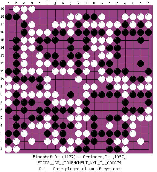 Last move : 0-1 2018 May 16 9:12:52 [Event "FICGS__GO__TOURNAMENT_KYU_I__000074"] [Site "FICGS"] [Date "2018.02.13"] [Round "1"] [Black "Fischhof,Andrew"] [White "Cerisara,Christophe"] [Result "0-1"] [Rating 1 "1127"] [Rating 2 "1097"] 1.r16 d4 2.q3 d16 3.q6 p17 4.p15 m17 5.c17 d17 6.c16 c15 7.b15 c14 8.b14 c13 9.b13 c12 10.k16 m15 11.l15 m14 12.e15 d15 13.e14 k3 14.c6 f4 15.m4 k5 16.q11 q9 17.p8 p9 18.o8 o10 19.d10 c8 20.b10 e8 21.b8 c9 22.c10 b9 23.b7 a8 24.b4 c3 25.b3 b2 26.c4 d2 27.e6 g7 28.d5 e4 29.f7 f8 30.g6 g8 31.h6 f5 32.f6 k7 33.l6 k6 34.b5 o4 35.n3 r4 36.q4 r5 37.r6 q5 38.p5 r3 39.o5 q2 40.p3 p2 41.o3 e12 42.f13 f12 43.b12 g17 44.l14 l13 45.k13 l12 46.k12 l11 47.o12 n11 48.o11 n10 49.r10 r9 50.g16 h17 51.h16 j17 52.k17 k18 53.g12 g11 54.h12 h11 55.l7 l8 56.m8 l9 57.j4 k4 58.j8 h7 59.j6 j7 60.h4 g3 61.h3 g2 62.h2 j2 63.l2 r18 64.s17 s18 65.s15 c18 66.b18 d19 67.s6 s5 68.j14 e11 69.e10 f10 70.d7 d8 71.c7 j11 72.k11 k10 73.o14 b19 74.a18 l17 75.s8 s9 76.s10 t10 77.t11 t9 78.s12 f16 79.f15 o16 80.q17 q18 81.p16 o17 82.o2 s2 83.r8 c11 84.b11 l5 85.m5 l3 86.m3 k2 87.m2 j12 88.j13 j16 89.j15 a10 90.a11 a9 91.a2 b1 92.l18 j18 93.m18 n18 94.m13 n13 95.m16 n15 96.n16 o15 97.p14 r17 98.q16 t17 99.s16 n17 100.l16 o13 101.p13 e13 102.g13 q8 103.q7 m9 104.n8 a7 105.a6 h1 106.p1 q1 107.o1 e16 108.n12 m12 109.g4 t6 110.t7 t5 111.t8 q10 112.o9 p10 113.p11 d14 114.g15 n14 115.e9 f9 116.k1 d11 117.t16 t18 118.e5 j1 119.l1 a1 120.a3 c19 121.g5 j5 122.f3 f2 0-1 Here are the names of the openings (joseki) played in the four corners : Corner q16 : r16 p17 Komoku (Somok, Xiao~mu`) 3-4 Point. The komoku (3-4) point is the traditional corner enclosure move.. Ikken Kakari (Hankan Keolch'im, Yi Gua`jiao~, 1-Space Low Pincer). The small knight move is the basic approach move to the 3-4 point stone. It has been continually used for over four centuries. There are limitless variations, with new moves constantly being discovered. White 2 opens the door to a treaure store of joseki. Corner d16 : d16 c17 Hoshi (Hwajeom, Seongjeom, Xingwei`) 4-4 Point. The star or hoshi (4-4) point, emphasizing influence at the potential expense of territory. Corner d4 : d4 c6 Hoshi (Hwajeom, Seongjeom, Xingwei`) 4-4 Point. The star or hoshi (4-4) point, emphasizing influence at the potential expense of territory. Ikken Kakari (Hankan Keolch'im, Yi Gua`jiao~, 1-Space Low Approach). Black 2 is the standard approach move to the 4-4. Player White won this Go (weiqi, baduk) game. Follow this game move after move (download)Territory is a closed space where time no longer exists. The transformation around it slower alter it, and sometimes it cracks open like a rotten egg at the least shock. (Pierre Audouard) Kids, you tried your best and you failed miserably. The lesson is, never try. (Simpsons)