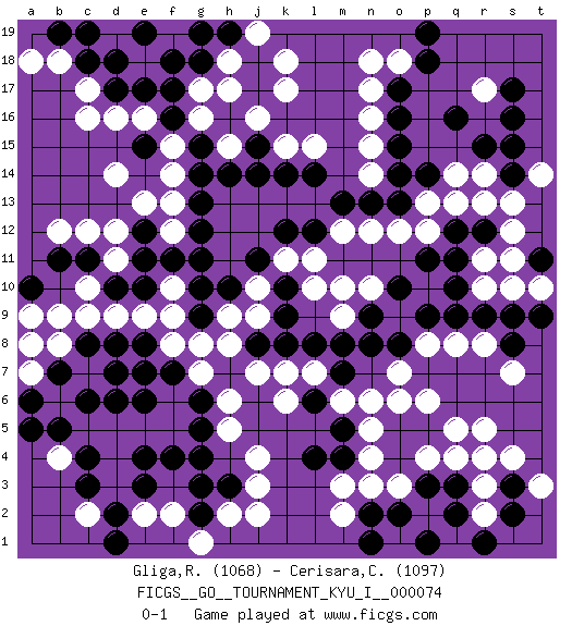 Last move : 0-1 2018 April 1 15:0:14 [Event "FICGS__GO__TOURNAMENT_KYU_I__000074"] [Site "FICGS"] [Date "2018.02.13"] [Round "1"] [Black "Gliga,Razvan"] [White "Cerisara,Christophe"] [Result "0-1"] [Rating 1 "1068"] [Rating 2 "1097"] 1.q16 d4 2.q3 d16 3.r9 c10 4.e3 d3 5.e4 e5 6.g3 f5 7.d2 c2 8.d1 k17 9.f17 d14 10.e15 e16 11.f16 f15 12.g15 f14 13.g14 f13 14.d18 c17 15.e17 n17 16.o17 n15 17.o15 n14 18.o14 r5 19.r4 q5 20.o4 q8 21.q9 p8 22.p9 r8 23.d8 e7 24.c6 c5 25.d6 d5 26.c8 e9 27.e8 f8 28.e6 f6 29.d10 d11 30.e10 f10 31.e11 d12 32.e12 e13 33.g12 f12 34.f11 d9 35.g11 c9 36.b5 b4 37.a5 b8 38.b7 a9 39.d7 a7 40.a6 a8 41.f7 g7 42.e7 g8 43.c11 c12 44.a10 b9 45.b11 b12 46.g13 j4 47.l4 j3 48.g5 h5 49.g4 h2 50.g2 f2 51.f4 e2 52.g6 h6 53.c3 r14 54.r15 q14 55.q12 p13 56.o13 p12 57.p11 o12 58.n13 n12 59.m13 h17 60.h16 j16 61.j15 k15 62.j14 n10 63.l14 l15 64.k14 s12 65.s14 s13 66.s16 m2 67.n2 n3 68.o2 m3 69.m4 n4 70.o5 n5 71.l6 m6 72.m7 o6 73.p5 p6 74.n9 m9 75.n8 l7 76.m5 n6 77.l8 k7 78.m8 m10 79.k8 j7 80.j8 h9 81.k10 l11 82.h10 m12 83.k12 s10 84.s9 t10 85.s8 s7 86.o8 o7 87.c4 o3 88.p3 r2 89.q2 s4 90.s3 r3 91.s2 q4 92.r1 r4 93.p1 t3 94.n1 k11 95.j11 j9 96.o10 r10 97.q10 r11 98.q11 r13 99.k9 r17 100.s17 o18 101.o16 n16 102.p18 n18 103.p19 p4 104.c18 b18 105.d17 c16 106.g18 h18 107.h19 j19 108.g19 k18 109.b19 a18 110.c19 g17 111.f18 g16 112.e19 h15 113.h14 h8 114.l12 j10 115.g10 f9 116.t11 l10 117.h3 j2 118.g9 k6 119.p14 q13 120.t9 t14 121.s15 g1 122.r12 s11 0-1 Here are the names of the openings (joseki) played in the four corners : Corner d4 : d4 e3 Hoshi (Hwajeom, Seongjeom, Xingwei`) 4-4 Point. The star or hoshi (4-4) point, emphasizing influence at the potential expense of territory. Corner d16 : d16 f17 Hoshi (Hwajeom, Seongjeom, Xingwei`) 4-4 Point. The star or hoshi (4-4) point, emphasizing influence at the potential expense of territory. Ikken Kakari (Hankan Keolch'im, Yi Gua`jiao~, 1-Space Low Approach). Black 2 is the standard approach move to the 4-4. Corner q16 : q16 n17 Hoshi (Hwajeom, Seongjeom, Xingwei`) 4-4 Point. The star or hoshi (4-4) point, emphasizing influence at the potential expense of territory. Niken Kakari (Dukan Keolch'im, E`r Gua`jiao~, 2-Space Low Approach). Black typically answers by 7-3 or 3-5 (which is not joseki). Player White won this Go (weiqi, baduk) game. Follow this game move after move (download)Keshi is worth as much as an invasion ! (Anonymous) Dave, my mind is going. I can feel it. (HAL 9000 in 2001, a space odyssey)