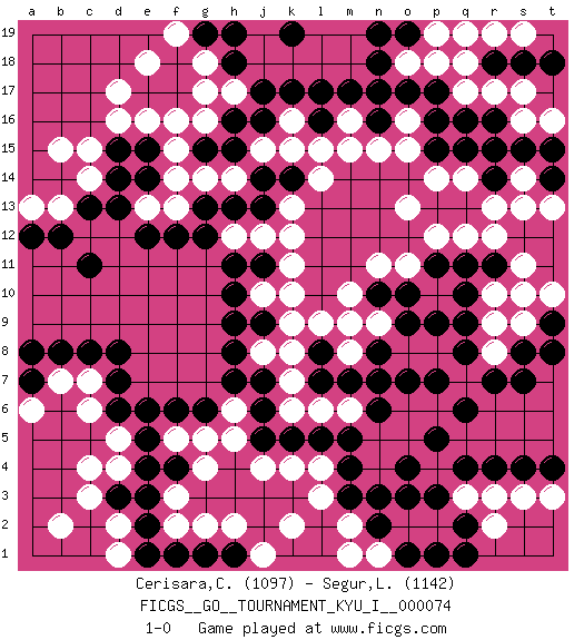 Last move : 1-0 2018 March 1 20:54:0 [Event "FICGS__GO__TOURNAMENT_KYU_I__000074"] [Site "FICGS"] [Date "2018.02.13"] [Round "1"] [Black "Cerisara,Christophe"] [White "Segur,Laurine"] [Result "1-0"] [Rating 1 "1097"] [Rating 2 "1142"] 1.q16 c4 2.q4 d17 3.e3 d2 4.d3 c3 5.e2 d1 6.c11 r17 7.r16 q17 8.p17 p18 9.o17 o18 10.n17 s16 11.s15 t16 12.n18 c14 13.s18 s17 14.o19 q19 15.r18 q18 16.t18 s19 17.c8 r13 18.r14 q12 19.r7 r9 20.p7 r3 21.r4 q3 22.p3 p2 23.o3 o2 24.n3 s3 25.s4 g4 26.e5 j4 27.n2 t3 28.t4 g17 29.j17 l3 30.g6 m2 31.o1 p1 32.q2 n1 33.q1 m1 34.o1 s13 35.h15 f15 36.g13 o15 37.p15 m15 38.l16 o13 39.j6 l6 40.m7 k7 41.h8 j8 42.j7 k9 43.h9 k11 44.h11 k13 45.p9 p10 46.o9 k15 47.j16 k16 48.k17 m16 49.m17 l15 50.l17 c6 51.d7 b7 52.b8 d5 53.e6 f5 54.f4 g5 55.f6 n11 56.d13 f13 57.f12 e13 58.e12 g14 59.h13 h14 60.h18 g18 61.e14 f14 62.d14 c15 63.g19 f19 64.h19 e18 65.e1 b2 66.s8 n9 67.n8 m9 68.o10 o11 69.q10 r10 70.p11 p12 71.r11 s11 72.q11 r12 73.q9 r8 74.q8 s9 75.t9 s10 76.s7 t10 77.t8 n5 78.p5 o6 79.o7 p6 80.q6 n4 81.o4 o5 82.c13 b13 83.b12 a13 84.a12 b15 85.t15 r19 86.m3 k2 87.m4 l4 88.m5 m6 89.n6 h17 90.k19 f3 91.e4 f2 92.f1 g2 93.g1 h2 94.h1 j1 95.l8 k8 96.n10 m10 97.a7 a6 98.a8 q14 99.q15 s14 100.r15 p19 101.n19 j15 102.h16 j10 103.h10 j12 104.j13 h12 105.g12 h5 106.j5 h6 107.h7 l9 108.l7 m8 109.n7 c7 110.d6 o16 111.p16 p14 112.j11 k12 113.j9 k10 114.j14 g16 115.k14 l14 116.n16 n15 117.e15 e16 118.d15 d16 119.l5 k6 120.k5 k4 121.t14 d4 122.d8 t13 123.g15 f16 124.pass r2 125.p1 1-0 Christophe Cerisara Merci à toi aussi ! C'était très serré, et j'ai eu peur par moment; par ex. lorsque je croyais avoir pris le coin, mais tu as posé un coup qui te garantissait le seki, bravo ! Laurine Segur Oui, c'est à ce moment-là que j'ai compris que ça allait être compliqué ^^ (et la suite l'a confirmé ^^). Félicitations ! Here are the names of the openings (joseki) played in the four corners : Corner d4 : c4 e3 Komoku (Somok, Xiao~mu`) 3-4 Point. The komoku (3-4) point is the traditional corner enclosure move.. Ikken Kakari (Hankan Keolch'im, Yi Gua`jiao~, 1-Space Low Pincer). The small knight move is the basic approach move to the 3-4 point stone. It has been continually used for over four centuries. There are limitless variations, with new moves constantly being discovered. Black 2 opens the door to a treaure store of joseki. Corner d16 : d17 c11 Komoku (Somok, Xiao~mu`) 3-4 Point. The komoku (3-4) point is the traditional corner enclosure move.. Corner q16 : q16 r17 Hoshi (Hwajeom, Seongjeom, Xingwei`) 4-4 Point. The star or hoshi (4-4) point, emphasizing influence at the potential expense of territory. Player Black won this Go (weiqi, baduk) game. Follow this game move after move (download)Balance is not what players strike for, and if it does arise, it is in spite of them. (Pierre Audouard) Computers are like Old Testament gods; lots of rules and no mercy. (Joseph Campbell)
