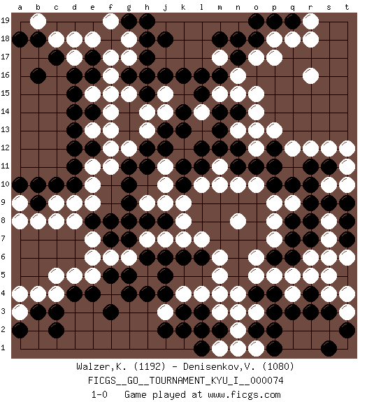 Last move : 1-0 2018 July 3 16:4:43 [Event "FICGS__GO__TOURNAMENT_KYU_I__000074"] [Site "FICGS"] [Date "2018.02.13"] [Round "1"] [Black "Walzer,Karel"] [White "Denisenkov,Valentin"] [Result "1-0"] [Rating 1 "1192"] [Rating 2 "1080"] 1.d4 r16 2.q3 r5 3.d16 f17 4.h17 f15 5.d14 e13 6.d13 d18 7.c17 c18 8.d10 p17 9.n17 o15 10.l16 f4 11.h4 d5 12.e4 e5 13.f3 c4 14.c3 c5 15.f5 c9 16.c10 d9 17.r7 p5 18.o4 m5 19.l3 o5 20.q10 r12 21.r11 q12 22.o11 p8 23.q8 n8 24.s9 f6 25.g5 e7 26.k10 o10 27.p10 n10 28.n11 l10 29.k13 k9 30.k11 j9 31.k6 m3 32.n3 l4 33.m2 m4 34.k3 k4 35.j5 j3 36.j4 l2 37.k2 n2 38.l1 o3 39.p3 n4 40.r4 s4 41.s3 q4 42.r3 s5 43.p2 t3 44.t2 t4 45.s1 s7 46.p12 p13 47.o13 o14 48.n14 n15 49.m14 m15 50.l15 m17 51.m16 o17 52.n18 n16 53.m18 h14 54.h8 l7 55.g11 g12 56.h12 f12 57.f8 h7 58.g7 g6 59.h6 j7 60.j8 k7 61.j6 k8 62.g9 h9 63.g8 m11 64.m12 l14 65.k14 n13 66.m13 o12 67.p11 h16 68.j16 g17 69.h18 g18 70.j18 j15 71.k16 h13 72.j12 e10 73.g10 e9 74.d11 s8 75.r8 p7 76.q6 q5 77.l11 m10 78.b3 b4 79.b9 b8 80.b10 c8 81.f7 e6 82.g4 p9 83.p6 o6 84.s11 s12 85.q19 q18 86.p19 r19 87.o18 p18 88.o19 r18 89.l6 m6 90.e16 r6 91.q7 s10 92.r9 t11 93.r10 t10 94.t9 t12 95.p4 o13 96.n12 j10 97.g16 f16 98.h15 g15 99.h16 j14 100.e14 f14 101.e12 f11 102.h11 f13 103.e17 e18 104.b18 d17 105.b16 n1 106.j2 m1 107.l2 a3 108.a2 a4 109.c2 b19 110.a18 e15 111.d15 o1 112.p1 e11 113.d12 a9 114.a10 a8 115.e8 d8 116.t7 t6 117.t8 s6 118.o2 n3 119.g19 f19 120.h19 j11 121.j13 q9 122.l12 1-0 Here are the names of the openings (joseki) played in the four corners : Corner q4 : q3 r5 Komoku (Somok, Xiao~mu`) 3-4 Point. The komoku (3-4) point is the traditional corner enclosure move.. Ikken Kakari (Hankan Keolch'im, Yi Gua`jiao~, 1-Space Low Pincer). The small knight move is the basic approach move to the 3-4 point stone. It has been continually used for over four centuries. There are limitless variations, with new moves constantly being discovered. White 2 opens the door to a treaure store of joseki. Corner d16 : d16 f17 Hoshi (Hwajeom, Seongjeom, Xingwei`) 4-4 Point. The star or hoshi (4-4) point, emphasizing influence at the potential expense of territory. Ikken Kakari (Hankan Keolch'im, Yi Gua`jiao~, 1-Space Low Approach). White 2 is the standard approach move to the 4-4. Corner d4 : d4 f4 Hoshi (Hwajeom, Seongjeom, Xingwei`) 4-4 Point. The star or hoshi (4-4) point, emphasizing influence at the potential expense of territory. Ikken Takagakari (Hankan Nop'dakeolch'im, Yi Gaojia, 1-Space High Approach). Black typically responds at 6-4 or 3-10. Black 4-10 is played when Black finds play on the right side advantageous. Black 4-8 or 3-8 may be played when Black has support at top. Player Black won this Go (weiqi, baduk) game. Follow this game move after move (download)Always remember, keep the balance. [between territory and influence] (Figaro) Tomorrow's what you make of it. (Horatio Caine, C.S.I. Miami)