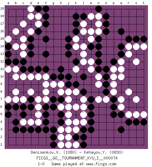 Last move : 1-0 2018 March 25 16:7:24 [Event "FICGS__GO__TOURNAMENT_KYU_I__000074 "] [Site "FICGS"] [Date "2018.02.13"] [Round "1"] [Black "Denisenkov,Valentin "] [White "Kehayov,Yulian "] [Result "1-0"] [Rating 1 "1080"] [Rating 2 "0830"] 1.q16 d16 2.q3 c4 3.e3 q10 4.f17 d10 5.c3 e4 6.f4 e6 7.f3 d4 8.d3 r5 9.p5 q7 10.d14 e18 11.f15 e17 12.f18 c15 13.f13 r14 14.q14 r13 15.q13 q12 16.p12 q11 17.c12 c10 18.f11 e10 19.e11 f9 20.g6 k4 21.m4 k6 22.m6 h3 23.l3 k3 24.k2 j2 25.l2 h6 26.h4 j4 27.h5 j6 28.f6 f7 29.g7 f8 30.l8 k8 31.k9 j8 32.j9 h8 33.h11 g9 34.b4 b5 35.b3 b11 36.b12 a11 37.b6 b7 38.c5 e5 39.c6 c7 40.r15 s14 41.s15 t14 42.t15 s12 43.k16 m16 44.o16 m15 45.n13 k15 46.j15 k14 47.j14 l16 48.k17 l17 49.l18 m18 50.k18 n17 51.o18 n18 52.o17 n16 53.m14 l13 54.j13 m12 55.n12 m11 56.o11 n10 57.o10 n9 58.o9 k11 59.k12 l12 60.l10 n7 61.p7 l14 62.n14 o7 63.p6 p8 64.o8 p9 65.m7 q6 66.q5 r8 67.r4 s5 68.h10 h9 69.j10 c14 70.d13 b14 71.s4 t5 72.t4 s7 73.d7 e7 74.d6 d8 75.a5 a7 76.a6 b8 77.g3 h2 78.g2 j5 79.a12 l5 80.m5 l6 81.c11 b10 82.e19 d18 83.e16 d19 84.f19 c17 85.d15 c13 86.f5 l7 87.h7 j7 88.d11 f10 89.g10 l4 90.a14 a15 91.a13 b16 92.n19 h1 93.g1 p10 94.n11 p11 95.n15 j1 96.m3 k1 97.l1 j3 98.pass 1-0 Here are the names of the openings (joseki) played in the four corners : Corner d4 : c4 e3Komoku (Somok, Xiao~mu`) 3-4 Point. The komoku (3-4) point is the traditional corner enclosure move..Ikken Kakari (Hankan Keolch'im, Yi Gua`jiao~, 1-Space Low Pincer). The small knight move is the basic approach move to the 3-4 point stone. It has been continually used for over four centuries. There are limitless variations, with new moves constantly being discovered. Black 2 opens the door to a treaure store of joseki. Corner d16 : d16 f17Hoshi (Hwajeom, Seongjeom, Xingwei`) 4-4 Point. The star or hoshi (4-4) point, emphasizing influence at the potential expense of territory.Ikken Kakari (Hankan Keolch'im, Yi Gua`jiao~, 1-Space Low Approach). Black 2 is the standard approach move to the 4-4. Corner q4 : q3 r5Komoku (Somok, Xiao~mu`) 3-4 Point. The komoku (3-4) point is the traditional corner enclosure move..Ikken Kakari (Hankan Keolch'im, Yi Gua`jiao~, 1-Space Low Pincer). The small knight move is the basic approach move to the 3-4 point stone. It has been continually used for over four centuries. There are limitless variations, with new moves constantly being discovered. White 2 opens the door to a treaure store of joseki. Corner q16 : q16 r14Hoshi (Hwajeom, Seongjeom, Xingwei`) 4-4 Point. The star or hoshi (4-4) point, emphasizing influence at the potential expense of territory.Ikken Kakari (Hankan Keolch'im, Yi Gua`jiao~, 1-Space Low Approach). White 2 is the standard approach move to the 4-4. Player Black won this Go (weiqi, baduk) game.Follow this game move after move (download ) Eyes win semiais. (Anonymous) I'll be back. (Arnold Schwarzenegger)