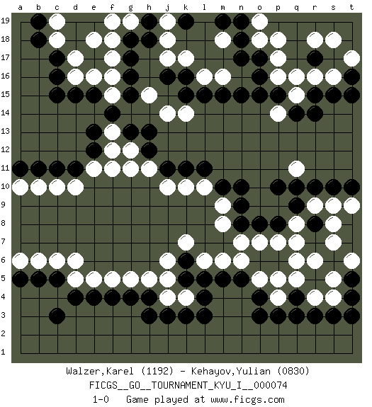 Last move : 1-0 2018 March 28 18:20:56 [Event "FICGS__GO__TOURNAMENT_KYU_I__000074 "] [Site "FICGS"] [Date "2018.02.13"] [Round "1"] [Black "Walzer,Karel "] [White "Kehayov,Yulian "] [Result "1-0"] [Rating 1 "1192"] [Rating 2 "0830"] 1.d4 q16 2.q4 d17 3.c15 r6 4.r8 q6 5.o4 d10 6.c17 d16 7.c16 q8 8.q9 r9 9.p8 q7 10.r10 s9 11.p10 s8 12.s10 r4 13.r3 s4 14.s3 q5 15.q14 k17 16.c11 c10 17.d11 d6 18.f4 k4 19.j3 j4 20.h3 h5 21.o16 p17 22.o17 p18 23.r17 r16 24.r15 s16 25.s15 r18 26.l3 k10 27.g16 f17 28.g17 f18 29.g18 c18 30.b18 c19 31.b19 e18 32.d15 e16 33.f14 f19 34.k16 m18 35.n18 l16 36.k15 f11 37.e12 e11 38.l15 m16 39.n15 j17 40.h18 j18 41.k19 j19 42.m19 o18 43.n17 h15 44.g15 j14 45.j16 k14 46.m15 m8 47.l11 l10 48.m10 m9 49.n10 f5 50.c5 e5 51.e4 c6 52.k11 j10 53.j11 h11 54.h12 g11 55.g13 f12 56.e13 b10 57.b11 n6 58.m5 m6 59.l5 l6 60.k5 j6 61.k6 k7 62.k3 j5 63.g4 g5 64.n8 n7 65.o8 o7 66.p15 p16 67.t16 t17 68.t15 s18 69.n5 p4 70.q3 o5 71.o3 p7 72.p3 p5 73.n9 o19 74.n19 g19 75.h19 b6 76.b5 a6 77.a5 a10 78.a11 q15 79.r14 g12 80.h13 t9 81.t10 s7 82.t4 s5 83.t5 t6 84.t3 d5 85.c3 f16 86.e15 f13 87.l4 p14 88.o15 q11 89.q10 f15 90.h4 1-0 Here are the names of the openings (joseki) played in the four corners : Corner d16 : d17 c15Komoku (Somok, Xiao~mu`) 3-4 Point. The komoku (3-4) point is the traditional corner enclosure move..Ikken Kakari (Hankan Keolch'im, Yi Gua`jiao~, 1-Space Low Pincer). The small knight move is the basic approach move to the 3-4 point stone. It has been continually used for over four centuries. There are limitless variations, with new moves constantly being discovered. Black 2 opens the door to a treaure store of joseki. Corner q4 : q4 r6Hoshi (Hwajeom, Seongjeom, Xingwei`) 4-4 Point. The star or hoshi (4-4) point, emphasizing influence at the potential expense of territory.Ikken Kakari (Hankan Keolch'im, Yi Gua`jiao~, 1-Space Low Approach). White 2 is the standard approach move to the 4-4. Corner q16 : q16 q14Hoshi (Hwajeom, Seongjeom, Xingwei`) 4-4 Point. The star or hoshi (4-4) point, emphasizing influence at the potential expense of territory.Ikken Takagakari (Hankan Nop'dakeolch'im, Yi Gaojia, 1-Space High Approach). White typically responds at 6-4 or 3-10. White 4-10 is played when White finds play on the right side advantageous. White 4-8 or 3-8 may be played when White has support at top. Corner d4 : d4 d6Hoshi (Hwajeom, Seongjeom, Xingwei`) 4-4 Point. The star or hoshi (4-4) point, emphasizing influence at the potential expense of territory.Ikken Takagakari (Hankan Nop'dakeolch'im, Yi Gaojia, 1-Space High Approach). Black typically responds at 6-4 or 3-10. Black 4-10 is played when Black finds play on the right side advantageous. Black 4-8 or 3-8 may be played when Black has support at top. Player Black won this Go (weiqi, baduk) game.Follow this game move after move (download ) Don't make dango's. (Anonymous) Life is like internet, nothing interesting, but noone want to leave it. (Ilmars Cirulis)