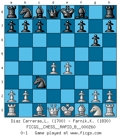 Last move : 0-1 2018 April 21 9:30:15 [Event "FICGS__CHESS__RAPID_B__000260"] [Site "FICGS"] [Date "2018.03.15"] [Round "1"] [White "Diaz Carreras,Leinier"] [Black "Farnik,Kym"] [Result "0-1"] [WhiteElo "1700"] [BlackElo "1830"] 1.c4 Nf6 2.d4 g6 3.Nc3 d5 4.cxd5 Nxd5 5.e4 Nxc3 0-1 This chess game has been lost on time (started : 2018.03.15 19:9:39) English, 1...Nf6 (Anglo-Indian defense) Player Black won this chess game. Follow this game move after move (download)Good offense and good defense both begin with good development. (Bruce A. Moon) Ich könnte leicht behaupten: Ja,ja, Leonid Breschnew wollte nicht, daß ich Weltmeister werde. In der Tat war die Sache komplizierter. (Viktor Kortschnoi) Diferente gente reacciona diferentemente en aceptar la derrota. (Bobby Fischer) La vie et les Echecs sont tous les deux une lutte constante. (Lasker) Men should grow up. - Yeah. And dogs should stop licking themselves. It's not gonna happen. (Gregory House to Dr. Cameron, House M.D.)