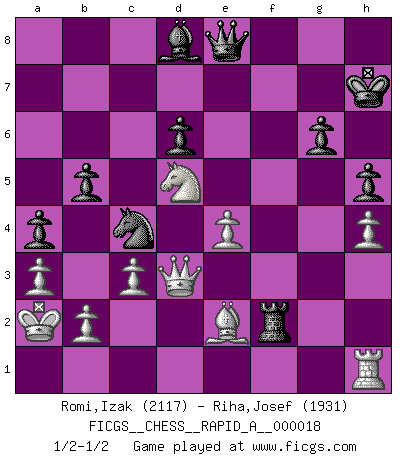 Last move : 1/2-1/2 2007 May 1 19:53:17 [Event "FICGS__CHESS__RAPID_A__000018"] [Site "FICGS"] [Date "2007.04.23"] [Round "1"] [White "Romi,Izak"] [Black "Riha,Josef"] [Result "1/2-1/2"] [WhiteElo "2117"] [BlackElo "1931"] 1.e4 c5 2.Nf3 d6 3.d4 cxd4 4.Nxd4 Nf6 5.Nc3 a6 6.Bg5 e6 7.f4 Be7 8.Qf3 Qc7 9.O-O-O Nbd7 10.g4 b5 11.Bxf6 Nxf6 12.g5 Nd7 13.f5 Bxg5+ 14.Kb1 Ne5 15.Qh5 Qe7 16.Nxe6 Bxe6 17.fxe6 g6 18.exf7+ Kxf7 19.Qe2 Kg7 20.Nd5 Qd8 21.Qe1 Bh4 22.Qc3 Ra7 23.Qa3 Bf2 24.h4 h5 25.Be2 Rf8 26.Rh3 Bc5 27.Qc3 Rf2 28.Rdh1 Raf7 29.R3h2 Rxh2 30.Rxh2 Rf2 31.Rh1 Qd7 32.Qe1 Qa7 33.a3 Bb6 34.Qd1 Bd8 35.Rh3 Qd7 36.Rh1 Qc6 37.Rh3 Qc8 38.Rh1 Qc5 39.Rh3 Rf7 40.Rh2 a5 41.c3 Rf2 42.Rh1 Nc4 43.Qd3 a4 44.Qh3 Qc6 45.Qd3 Kh7 46.Ka1 Qe8 47.Ka2 1/2-1/2 Sicilian : Najdorf, 7...Be7 Queenside Castling by player White (move 9) This chess game ended in a draw. Follow this game move after move (download)The way he plays Chess demonstrates a man's whole nature. (Stanley Ellin) Im Schach gewinnt jeder. Hat man Freunde am Spiel - und das ist die Hauptsache - ist auch der Verlust einer Partie kein Unglück. (David Bronstein) Aún deseo matar a Fischer. (Boris Spassky) Comme les marins qui ont mille raisons différentes d'aller en mer, les joueurs d'échecs en ont tout autant avant de s'installer devant une table et jouer... (Vincent Bertignac, philosophe) You know what they say : You lie down with the Devil, you wake up in Hell. (Horatio Caine, C.S.I. Miami)