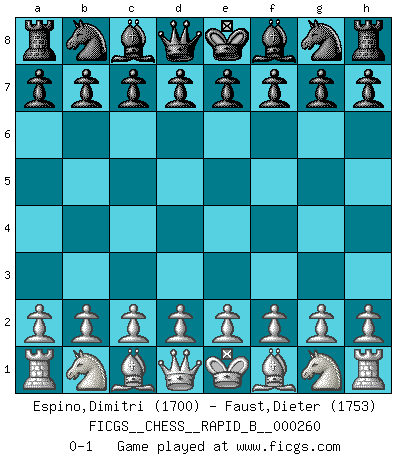 Last move : 0-1 2018 April 14 20:57:48 [Event "FICGS__CHESS__RAPID_B__000260"] [Site "FICGS"] [Date "2018.03.15"] [Round "1"] [White "Espino,Dimitri"] [Black "Faust,Dieter"] [Result "0-1"] [WhiteElo "1700"] [BlackElo "1753"] 0-1 This chess game has been lost on time (started : 2018.03.15 18:8:56) Player Black won this chess game. Follow this game move after move (download)Chess, like love, is infectious at any age. (Flohr) Sie bekommen vielleicht den Eindruck, dass die Spitzenspieler überhaupt gar nicht so stark sind. Aber das stimmt nicht. Es ist eine Illusion. Mit einem Computer an der Seite ist es sehr leicht, Urteile zu fällen, aber wenn man alleine am Brett sitzt, sieht die Sache ganz anders aus. (Vladimir Kramnik) El Ajedrez es despiadado: debes de estar preparado para matar gente. (Nigel Short) 'L'échange des dames est un coup dur pour les deux adversaires...' Un journaliste lors d'une partie du match Spassky-Fischer Be who you are, and say what you feel because those who mind don't matter, and those who matter don't mind. (Dr Seuss)