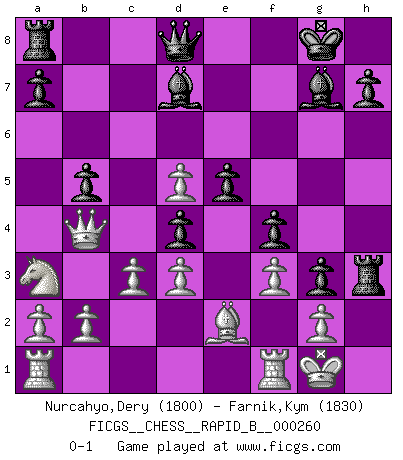 Last move : 0-1 2018 March 24 22:40:29 [Event "FICGS__CHESS__RAPID_B__000260"] [Site "FICGS"] [Date "2018.02.14"] [Round "1"] [White "Nurcahyo,Dery"] [Black "Farnik,Kym"] [Result "0-1"] [WhiteElo "1800"] [BlackElo "1830"] 1.e4 c5 2.Ne2 d6 3.d3 g6 4.Nbc3 Bg7 5.Nf4 Nc6 6.Be3 Nf6 7.Be2 O-O 8.Bf3 Nd4 9.O-O b6 10.Bxd4 cxd4 11.Nb5 Bd7 12.Na3 e5 13.Nd5 Nxd5 14.exd5 b5 15.Qd2 f5 16.Qb4 g5 17.Qxd6 g4 18.Be2 f4 19.f3 g3 20.c3 Rf6 21.Qb4 Rh6 22.h3 Rxh3 0-1 Sicilian : Keres variation (2.Ne2) Kingside Castling by player Black (move 7) Kingside Castling by player White (move 9) Player Black won this chess game. Follow this game move after move (download)Chess is as much a mystery as women. (Purdy) Kein Großmeister ist normal. Sie unterscheiden sich nur im Ausmaß Ihrer Verrücktheit. (Viktor Kortschnoi) Tu sabes, camarada Pachman, no disfruto el ser un Ministro, preferería jugar al Ajedrez como tu. (Che Guevara) Toute estimation doit être constamment réévaluée. (Jacob Estrin) . 'gn is not allowed in chess unless n is an integer between 1 and 8 inclusive, where 1 and 8 are to interpreted as the standard numerals standing for integers in the ordered real-closed field R, with the *canonical* ordering. (As opposed to, say, an integer in the domain Z[2+i*sqrt(5)] or an integer in some exotic Grothendieck topos). (Normajean Yates)