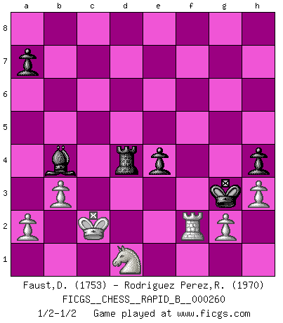 Last move : 1/2-1/2 2018 June 17 12:39:52 [Event "FICGS__CHESS__RAPID_B__000260"] [Site "FICGS"] [Date "2018.02.14"] [Round "1"] [White "Faust,Dieter"] [Black "Rodriguez Perez,Rene"] [Result "1/2-1/2"] [WhiteElo "1753"] [BlackElo "1970"] 1.e4 e6 2.d4 d5 3.Nc3 Nf6 4.Bg5 dxe4 5.Nxe4 Be7 6.Bxf6 gxf6 7.Qd2 b6 8.O-O-O Bb7 9.Nc3 Nc6 10.Qe3 Nb4 11.Nge2 Nd5 12.Nxd5 Qxd5 13.Nc3 Qf5 14.Bb5+ c6 15.Bd3 Qg4 16.h3 Qg7 17.Kb1 O-O-O 18.f4 Kb8 19.f5 c5 20.Be4 cxd4 21.Rxd4 Qg5 22.Qxg5 fxg5 23.Rxd8+ Rxd8 24.fxe6 Bxe4 25.Nxe4 fxe6 26.c3 Rf8 27.Kc2 h5 28.Re1 Kc7 29.Re2 Kd7 30.Ng3 h4 31.Ne4 e5 32.Nf2 Ke6 33.Kd3 Rf4 34.Ng4 Bd6 35.Re4 Rf1 36.Re2 Rf4 37.b3 b5 38.Nf2 b4 39.Ne4 bxc3 40.Nxg5+ Kf5 41.Ne4 Bb4 42.Nxc3 Rd4+ 43.Kc2 Kf4 44.Nd1 e4 45.Rf2+ Kg3 46.Re2 Kf4 47.Rf2+ Kg3 1/2-1/2 French : Burn variation Queenside Castling by player White (move 8) Queenside Castling by player Black (move 17) This chess game ended in a draw. Follow this game move after move (download)I'd rather have a Pawn than a finger. (Reuben Fine) Das Schach ist nichts für kleine Geister, es beansprucht einen vollen Mann, der sich nicht sklavisch an das Überlieferte hält, sondern selbständig die Tiefen des Spiels zu ergründen sucht. (Wilhelm Steinitz) Me gusta decir que Bobby Fischer fue el mejor jugador que jamás haya existido. Pero lo que hizo de Fischer un genio, fue su habilidad de mezclar una frescura y pragmatismo Americano con ideas Rusas acerca de la estrategia. (Bruce Pandolfini) Avec des compensations pour le matériel en plus... (Anonyme) First of all, we have to go back to the classical time control. (Anatoly Karpov)