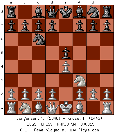 Last move : 0-1 2018 March 20 5:59:7 [Event "FICGS__CHESS__RAPID_SM__000015"] [Site "FICGS"] [Date "2018.02.15"] [Round "1"] [White "Jorgensen,PoulErik"] [Black "Kruse,Herbert"] [Result "0-1"] [WhiteElo "2346"] [BlackElo "2445"] 1.e4 e5 2.Nf3 Nc6 0-1 This chess game has been lost on time (started : 2018.02.15 19:26:11) King's pawn game Player Black won this chess game. Follow this game move after move (download)I'm not a materialistic person, in that, I don't suffer the lack or loss of money. The absence of worldly goods I don't look back on. For Chess is a way I can be as materialistic as I want without having to sell my soul. (Jamie Walter Adams) Wie ich sie so einen nach dem anderen nieder mähte wurde meine Überlegenheit offensichtlich. (José Raúl Capablanca) Cuando le juegas a Fischer, no es una cuestion de si vas a ganar o perder. Es una cuestion de si vas a sobrevivir. (Boris Spassky) Des points faibles ou des trous dans la position de l'adversaire doivent être occupés par des pièces et non pas par des pions. (Siegbert Tarrasch) There are lots of people who mistake their imagination for their memory. (Josh Bilings)