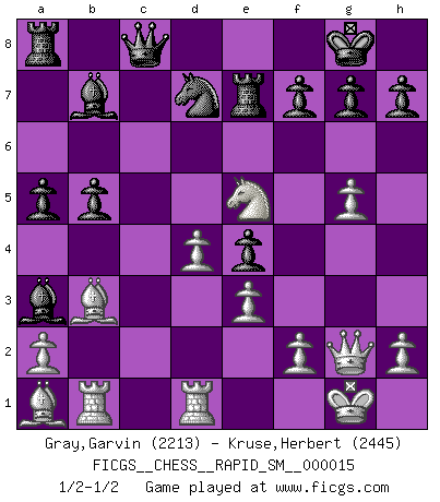 Last move : 1/2-1/2 2018 April 23 15:49:57 [Event "FICGS__CHESS__RAPID_SM__000015"] [Site "FICGS"] [Date "2018.02.15"] [Round "1"] [White "Gray,Garvin"] [Black "Kruse,Herbert"] [Result "1/2-1/2"] [WhiteElo "2213"] [BlackElo "2445"] 1.d4 Nf6 2.c4 e6 3.Nc3 Bb4 4.e3 O-O 5.Bd3 d5 6.cxd5 exd5 7.Nge2 Re8 8.Bd2 b6 9.Rc1 Bf8 10.Nf4 Bb7 11.Qf3 a6 12.O-O Ra7 13.Rfd1 c5 14.Bc2 c4 15.g4 Ne4 16.Qg2 Bd6 17.Nxe4 dxe4 18.Bc3 Nd7 19.b3 cxb3 20.Bxb3 Ra8 21.Nd3 Re7 22.Ne5 Ba3 23.Rb1 b5 24.g5 Qc8 25.Ba1 a5 1/2-1/2 Nimzo-Indian : 4.e3 O-O, 5.Bd3 d5 Kingside Castling by player Black (move 4) Kingside Castling by player White (move 12) This chess game ended in a draw. Follow this game move after move (download)Chess is the art of analysis. (Mikhail Botvinnik) Frage des Reporters: -Worin besteht das Ziel von Gambiteröffnungen? Antwort: -Auf Kosten der Partie einen Ruf als Angriffspieler zu erwerben.- (Siegbert Tarrasch) Cada Peón es una Reina en potencia. (James Mason) Karpov est une pièce de musée. (Garry Kasparov) Rules and bones are meant to be broken. (Anonymous)