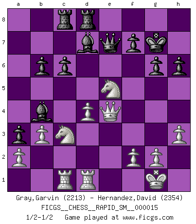 Last move : 1/2-1/2 2018 April 13 2:4:3 [Event "FICGS__CHESS__RAPID_SM__000015"] [Site "FICGS"] [Date "2018.02.15"] [Round "1"] [White "Gray,Garvin"] [Black "Hernandez,David"] [Result "1/2-1/2"] [WhiteElo "2213"] [BlackElo "2354"] 1.d4 d5 2.c4 e6 3.Nc3 Nf6 4.Nf3 c6 5.Bg5 h6 6.Bxf6 Qxf6 7.Qb3 a5 8.e3 a4 9.Qc2 a3 10.b3 Bb4 11.Rc1 O-O 12.Be2 Nd7 13.O-O Qe7 14.Rfd1 b6 15.cxd5 exd5 16.Bd3 Rb8 17.Bh7+ Kh8 18.Bf5 Rd8 19.h3 g6 20.Bxd7 Bxd7 21.Ne5 Kg7 22.e4 dxe4 23.Qxe4 Rbc8 1/2-1/2 QGD Semi-Slav : Hastings variation Kingside Castling by player Black (move 11) Kingside Castling by player White (move 13) This chess game ended in a draw. Follow this game move after move (download)The laws of Chess do not permit a free choice: you have to move whether you like it or not. (Emanuel Lasker) Die Fehler sind da, Sie warten nur darauf gemacht zu werden. (Savielly Grigorievitsch Tartakower) La vida es como un juego de Ajedrez, cambiando con cada movimiento. (Proverbio Chino) Soyez une menace à chaque fois que vous vous asseyez pour jouer. (Ken Smith) Life is like a game of cards: the hand you are dealt represents determinism; the way you play it is free will. (Jawaharlal Nehru)