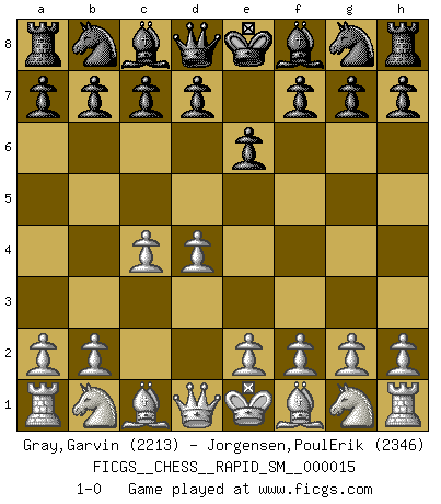 Last move : 1-0 2018 March 20 5:59:7 [Event "FICGS__CHESS__RAPID_SM__000015"] [Site "FICGS"] [Date "2018.02.15"] [Round "1"] [White "Gray,Garvin"] [Black "Jorgensen,PoulErik"] [Result "1-0"] [WhiteElo "2213"] [BlackElo "2346"] 1.d4 e6 2.c4 1-0 This chess game has been lost on time (started : 2018.02.15 19:26:11) Queen's pawn Player White won this chess game. Follow this game move after move (download)A passed Pawn increases in strength as the number of pieces on the board diminishes. (Capablanca) Obendrein hat der FIDE-Präsident den Revolutionsführer Gaddafi zum »Großmeister« ernannt, am Ende der WM. Das ist lächerlich! (Joel Lautier) La belleza de un movimiento no se refleja solo en su apariencia, sino en el pensamiento detrás de él. (Siegbert Tarrasch) Aidez vos pièces, elles vous aideront. (Paul Morphy) Perfection is achieved, not when there is nothing more to add, but when there is nothing left to take away. (Antoine de Saint-Exupéry)