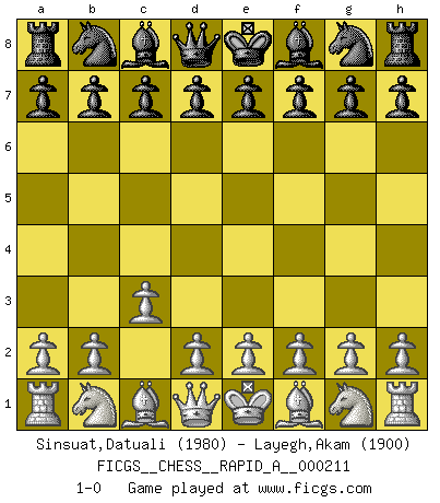Last move : 1-0 2018 March 18 5:44:36 [Event "FICGS__CHESS__RAPID_A__000211"] [Site "FICGS"] [Date "2018.02.15"] [Round "1"] [White "Sinsuat,Datuali"] [Black "Layegh,Akam"] [Result "1-0"] [WhiteElo "1980"] [BlackElo "1900"] 1.c3 1-0 This chess game has been lost on time (started : 2018.02.15 19:30:48) Saragossa Opening Player White won this chess game. Follow this game move after move (download)Modern Chess is too much concerned with things like Pawn structure. Forget it, Checkmate ends the game. (Nigel Short) Wenn Schach ein enormer Dschungel ist, der seine Myriaden von Geheimnissen nicht preisgeben will, dann sind Computer die Kettensägen einer gewaltigen ökologisch unsensiblen Nutzholzfirma. (Nigel Short) El Ajedrez era la lengua materna de Capablanca. (Reti) Les Echecs représentent une sphère d'idées créatrices basée sur la volonté des deux protagonistes. (Smyslov) The various flowers seem good to different people. (Chinese proverb)