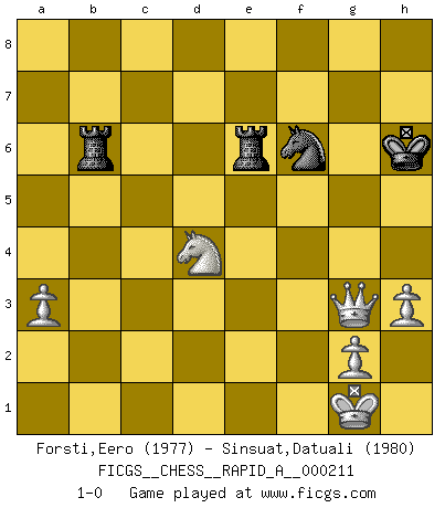 Last move : 1-0 2018 June 18 3:11:0 [Event "FICGS__CHESS__RAPID_A__000211"] [Site "FICGS"] [Date "2018.02.15"] [Round "1"] [White "Forsti,Eero"] [Black "Sinsuat,Datuali"] [Result "1-0"] [WhiteElo "1977"] [BlackElo "1980"] 1.d4 c6 2.c4 d6 3.e4 Nd7 4.Nc3 Qc7 5.Be3 e5 6.Nf3 Ngf6 7.d5 Be7 8.h3 Nc5 9.Nd2 a5 10.a3 O-O 11.b4 Na6 12.b5 Nc5 13.Be2 Nfd7 14.dxc6 bxc6 15.O-O Bb7 16.Rb1 Ne6 17.Bg4 cxb5 18.Nd5 Bxd5 19.exd5 Nec5 20.Bxd7 Nxd7 21.cxb5 Qb7 22.b6 f5 23.f4 exf4 24.Bxf4 Qxd5 25.Qe2 Rf7 26.Qb5 Qb7 27.Rfc1 d5 28.Be3 Bd6 29.Rc6 Bg3 30.Nf1 Re8 31.Rbc1 d4 32.Bxd4 Bf4 33.R1c4 Be5 34.Nd2 Qb8 35.Nf3 Bxd4+ 36.Rxd4 h6 37.R4d6 R8e7 38.Qxa5 Kh7 39.Qd5 Qb7 40.Rxh6+ gxh6 41.Rxh6+ Kxh6 42.Qxb7 Rf6 43.Qd5 Rxb6 44.Nd4 Nf6 45.Nxf5+ Kh7 46.Qc5 R7e6 47.Qc7+ Kg6 48.Nh4+ Kh6 49.Qg3 Kh7 50.Nf3 Ne4 51.Qc7+ Kg6 52.Qf4 Nf6 53.Qg3+ Kh6 54.Nd4 1-0 This chess game has been lost on time (started : 2018.02.15 19:30:48) Queen's pawn Kingside Castling by player Black (move 10) Kingside Castling by player White (move 15) 10 pieces endgame at move 45 : White KQNPPP , Black KRRN WHITE : King + 1 Queen 1 Knight 3 Pawns BLACK : King + 2 Rooks 1 Knight Player White won this chess game. Follow this game move after move (download)The boy (then a 12 year old boy named Anatoly Karpov) doesn't have a clue about Chess, and there's no future at all for him in this profession. (Mikhail Botvinnik) Es gibt Leute, die glauben, alles wäre vernünftig, was man mit einem ernsthaften Gesicht tut. (Georg Christoph Lichtenberg) ¿Quién es tu oponente esta tarde? Esta tarde mi oponente son las piezas negras. (Akiba Rubinstein) Même un GMI sait rarement calculer sur plus de cinq coups une attaque à sacrifices. (Rudolf Spielmann) Heh, heh, heh. Time to abandon ship. (General Grievous in Star Wars ep.3)