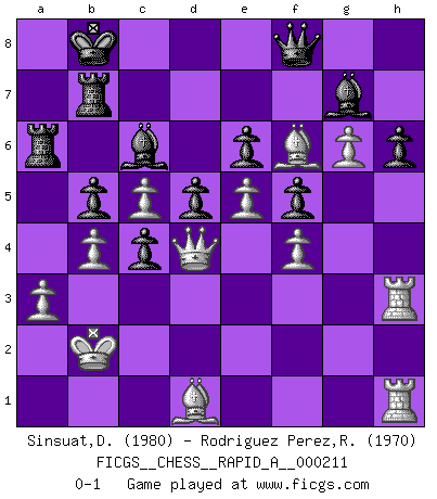 Last move : 0-1 2018 November 8 22:12:42 [Event "FICGS__CHESS__RAPID_A__000211"] [Site "FICGS"] [Date "2018.02.15"] [Round "1"] [White "Sinsuat,Datuali"] [Black "Rodriguez Perez,Rene"] [Result "0-1"] [WhiteElo "1980"] [BlackElo "1970"] 1.e4 e6 2.d4 d5 3.Nc3 Nf6 4.e5 Nfd7 5.f4 c5 6.Nf3 Nc6 7.Be3 Qb6 8.Na4 Qa5+ 9.c3 c4 10.b4 Qc7 11.g3 Be7 12.Bg2 b5 13.Nc5 a5 14.a3 Nxc5 15.dxc5 Bd7 16.O-O g6 17.Nd4 Nxd4 18.Bxd4 O-O 19.Qf3 Ra6 20.g4 Rc8 21.h4 Rca8 22.Qh3 Qd8 23.Rf3 axb4 24.cxb4 f5 25.h5 Be8 26.hxg6 Bxg6 27.g5 R8a7 28.R3f1 Qa8 29.Bb2 Qd8 30.Rfd1 Kf7 31.Bf3 Bf8 32.Kg2 Qe8 33.Be2 Ke7 34.Rh1 Qa8 35.Rhd1 Kf7 36.Kf2 Ke7 37.Qe3 Kd7 38.Rh1 Kc7 39.Rh3 Kb8 40.Kg1 Rg7 41.Kf2 Kc8 42.Bd4 Qc6 43.Bd1 Be8 44.Ra2 R6a7 45.Qc1 Rgb7 46.Rg3 h6 47.g6 Bg7 48.Kg1 Kb8 49.Rh2 Bf8 50.Kf1 Ra8 51.Ke1 Bg7 52.Kd2 Qc8 53.Ke1 Bc6 54.Rgh3 Rc7 55.Kf1 Ra6 56.Qb2 Rca7 57.Rc2 Qb7 58.Ke1 Qd7 59.R2c3 Rc7 60.Qg2 Rca7 61.Bh5 Bf8 62.Rcg3 Bg7 63.Qd2 Ra8 64.Kd1 Qc8 65.Kc2 R8a7 66.Kb2 Qd7 67.Rc3 Qe7 68.Rh1 Bf8 69.Bd1 Qe8 70.Bh5 Qd7 71.Bf3 Qe8 72.Bh5 Bg7 73.R1h3 Qd8 74.Rh1 Bf8 75.Ra1 Qh4 76.Bf3 Qe7 77.Bf2 Qd8 78.Qd4 Be8 79.Rg1 Bg7 80.Bh5 Bc6 81.Rh3 Bf8 82.Bh4 Qc8 83.Bd1 Bg7 84.Bf6 Qf8 85.Bh5 Qe8 86.Bd1 Qf8 87.Rgh1 Rb7 0-1 This chess game has been lost on time (started : 2018.02.15 19:30:48) French : Steinitz, Boleslavsky variation Kingside Castling by player White (move 16) Kingside Castling by player Black (move 18) Player Black won this chess game. Follow this game move after move (download)Chess is not like life... it has rules ! (Mark Pasternak) Wenn Capablanka heute auf der Schachbühne erscheinen würde, hätte er ein halbes Jahr gebraucht um sich die Schachtheorie anzueignen. Und dann hätte er alles und jeden besiegt. (Mikhail Moiseyevich Botvinik) Hay dos clases de hombres: aquellos que se conforman en dejarse llevar por las circunstancias y que juegan barajas y aquellos decididos a controlar las circunstancias y que juegan al Ajedrez. (Mortimer Collins) Un footballeur joue avec ses pieds, parfois avec sa tête. Un joueur d'échecs ne joue qu'avec sa tête. Et quand il ne joue plus, il meurt. (Jacob Murray) All battles are fought by scared men who'd rather be someplace else. (John Wayne in the movie In harm's way)