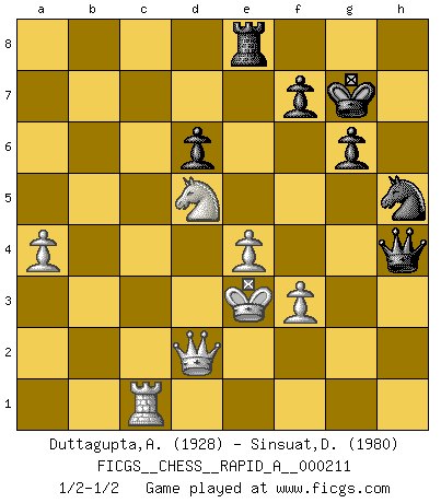 Last move : 1/2-1/2 2018 July 20 20:57:6 [Event "FICGS__CHESS__RAPID_A__000211"] [Site "FICGS"] [Date "2018.02.15"] [Round "1"] [White "Duttagupta,Aniruddha"] [Black "Sinsuat,Datuali"] [Result "1/2-1/2"] [WhiteElo "1928"] [BlackElo "1980"] 1.d4 c6 2.c4 d6 3.Nc3 Nd7 4.e4 Qc7 5.Nf3 e5 6.Be2 Ngf6 7.O-O Be7 8.h3 O-O 9.Be3 Re8 10.Qc2 exd4 11.Nxd4 Bf8 12.b4 g6 13.Rfd1 b6 14.Bf4 Bb7 15.f3 a5 16.b5 c5 17.Nc6 Bxc6 18.bxc6 Qxc6 19.Rd2 Re6 20.Rad1 Rae8 21.Qb3 Ne5 22.Bg5 Ned7 23.h4 Qc8 24.Nb5 Qb8 25.Bf4 Ne5 26.g4 Rd8 27.Qe3 Nc6 28.Bf1 Ne8 29.Bg5 Be7 30.Nc3 Bf6 31.Bxf6 Nxf6 32.Bh3 Ne5 33.g5 Nh5 34.Nd5 Nxc4 35.Qd3 Ne5 36.Qc3 Rde8 37.Bxe6 Rxe6 38.a4 Nc6 39.Kf2 Re8 40.Qb3 Qc8 41.Rh1 Nd4 42.Qxb6 Qe6 43.Rxd4 cxd4 44.Qxd4 Qd7 45.Rb1 h6 46.gxh6 Qd8 47.Rh1 Kh7 48.Qb6 Qc8 49.Qc7 Qe6 50.Rc1 Kxh6 51.Qxa5 Qh3 52.Qd2+ Kg7 53.Ke3 Qxh4 1/2-1/2 Queen's pawn Kingside Castling by player White (move 7) Kingside Castling by player Black (move 8) This chess game ended in a draw. Follow this game move after move (download)The most important feature of the Chess position is the activity of the pieces. This is absolutely fundamental in all phases of the game: Opening, Middlegame and especially Endgame. The primary constraint on a piece's activity is the Pawn structure. (Michael Stean) Intelligenz läßt sich nicht am Weg, sondern nur am Ergebnis feststellen. (Garry Kasparov) Si tu oponente no puede hacer nada activo, entonces no apures la posición; En vez de eso, dejalo estar sentado ahí, sufriendo y rogandote por un empate. (Jeremy Silman) Si rien de grave n'est détecté lors de l'analyse d'une position, on joue alors le coup. Seconde règle de Blumenfeld. Somewhere in the world there is an epigram for every dilemma. (Hendrik Willem van Loon)