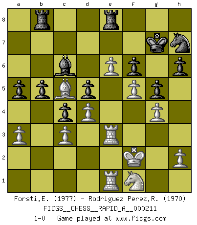 Last move : 1-0 2018 May 26 0:56:8 [Event "FICGS__CHESS__RAPID_A__000211"] [Site "FICGS"] [Date "2018.02.15"] [Round "1"] [White "Forsti,Eero"] [Black "Rodriguez Perez,Rene"] [Result "1-0"] [WhiteElo "1977"] [BlackElo "1970"] 1.d4 e6 2.c4 d5 3.Nc3 Nf6 4.cxd5 exd5 5.Bg5 Nbd7 6.Nf3 Bb4 7.e3 c5 8.Bd3 Qa5 9.Qc2 c4 10.Bf5 O-O 11.O-O Re8 12.Nd2 g6 13.Bxd7 Nxd7 14.e4 Bxc3 15.Qxc3 Qxc3 16.bxc3 Nb6 17.f3 Bd7 18.Rab1 Kg7 19.e5 Bf5 20.Rb4 Bd7 21.g4 Rab8 22.a3 h6 23.Bf6+ Kg8 24.R4b1 Bc6 25.f4 Kh7 26.Rf3 Nd7 27.Bh4 Rg8 28.Rh3 Kg7 29.f5 f6 30.Re1 Rbe8 31.e6 Nf8 32.Nf1 Nh7 33.Ne3 Rh8 34.Ng2 g5 35.Bg3 Re7 36.Bd6 R7e8 37.Ne3 Ra8 38.Ra1 Rhd8 39.Bg3 b5 40.Bc7 Rdc8 41.Bd6 a5 42.Re1 Re8 43.Rg3 Rad8 44.Bc5 Rb8 45.Nf1 Rb7 46.Kf2 R7b8 47.Rge3 1-0 Queen's pawn Kingside Castling by player Black (move 10) Kingside Castling by player White (move 11) Player White won this chess game. Follow this game move after move (download)We like to think. (Gary Kasparov) Das Schach hält seine Meister in eigenen Banden, Fesseln; auf vielerlei Weise formt es ihren Geist, so dass die innere Freiheit selbst des Stärksten beeinflusst wird. (Albert Einstein) Aquel que ve no otra dirección en el juego que la de dar Jaque Mate a su oponente, nunca será un buen jugador de Ajedrez. (Euwe) Horreur, mais aussi harmonie suprême : qu'y avait-il en effet au monde en dehors des échecs ? Le brouillard, l'inconnu, le non-être... (Vladimir Nabokov) When the going gets tactical, the computers get going. (Hyatt)