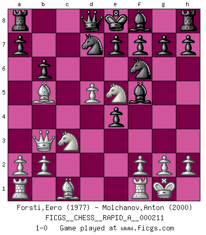 Last move : 1-0 2018 March 28 19:26:50 [Event "FICGS__CHESS__RAPID_A__000211"] [Site "FICGS"] [Date "2018.02.15"] [Round "1"] [White "Forsti,Eero"] [Black "Molchanov,Anton"] [Result "1-0"] [WhiteElo "1977"] [BlackElo "2000"] 1.d4 d5 2.c4 c6 3.Nf3 Nf6 4.Nc3 Bf5 5.cxd5 cxd5 6.Qb3 b6 7.e4 dxe4 8.Ne5 Be6 9.Bb5+ Nbd7 10.d5 Bf5 11.O-O 1-0 This chess game has been lost on time (started : 2018.02.15 19:30:48) QGD Slav : 4.Nc3 Kingside Castling by player White (move 11) Player White won this chess game. Follow this game move after move (download)Chess is 99 percent tactics. (Teichmann) Man kann eine Schachpartie nur gewinnen, wenn das Gleichgewicht gestört ist. In einer Stellung mit ungestörtem Gleichgewicht ist auch das größte Genie hilflos - in der Stellung steckt dann eben kein genialer Einfall. (Wilhelm Steinitz) Aquel que toma al Peón de Caballo de la Reina, se pasará la noche a dormir en la calle. (Anónimo) Les échecs sont utiles à l'exercice de la faculté de penser et à celle de l'imagination. Car nous devons posséder une méthode élaborée pour atteindre des buts partout où nous devons conduire notre raison. (Leibnitz) Any activity becomes creative when the doer cares about doing it right or doing it better. (John Updike)