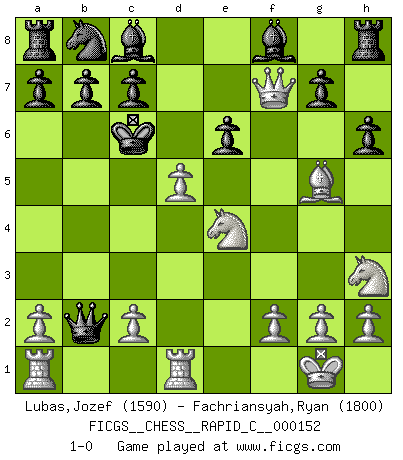 Last move : 1-0 2018 April 3 7:59:5 [Event "FICGS__CHESS__RAPID_C__000152"] [Site "FICGS"] [Date "2018.02.15"] [Round "1"] [White "Lubas,Jozef"] [Black "Fachriansyah,Ryan"] [Result "1-0"] [WhiteElo "1590"] [BlackElo "1800"] 1.e4 e6 2.d4 Nf6 3.e5 Ne4 4.Nh3 f6 5.Bd3 f5 6.O-O h6 7.Bxe4 fxe4 8.Qh5+ Ke7 9.Nc3 d5 10.exd6+ Qxd6 11.Bg5+ Kd7 12.Nxe4 Qb4 13.Rfd1 Qxb2 14.Qf7+ Kc6 15.d5+ 1-0 This chess game has been lost on time (started : 2018.02.15 20:17:28) French defense Kingside Castling by player White (move 6) Player White won this chess game. Follow this game move after move (download)I had a toothache during the first game. In the second game I had a headache. In the third game it was an attack of rheumatism. In the fourth game, I wasn't feeling well. And in the fifth game? Well, must one have to win every game ? (Siegbert Tarrasch) Deine Wertungszahl - vorausgesetzt einige Jahre schachliche Anstrengung - entspricht etwa dem zehnfachen Deines IQ plus 1000. (Jonathan Levitt) Siempre es mejor sacrificar los hombres de tu oponente. (Savielly Tartakower) Il n'y a pas eu de défaite parce que je ne crois pas que cet ordinateur ait jamais existé. IBM a triché en refusant d'imprimer les modes de recherche de la machine. C'est évident, pendant le match, des coups décisifs ont été joués par des êtres humains. Aujourd'hui, les meilleurs spécialistes en informatique ne peuvent toujours pas expliquer comment Deep-Blue a pu jouer contre la logique des ordinateurs. IBM a gagné une guerre de communication, mais ils sont incapables de prouver que l'ordinateur a gagné tout seul. (Garry Kasparov) Life is like internet, nothing interesting, but noone want to leave it. (Ilmars Cirulis)