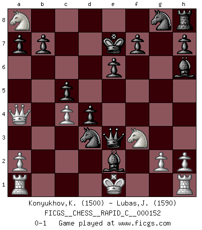 Last move : 0-1 2018 February 18 23:28:7 [Event "FICGS__CHESS__RAPID_C__000152"] [Site "FICGS"] [Date "2018.02.15"] [Round "1"] [White "Konyukhov,Konstantin"] [Black "Lubas,Jozef"] [Result "0-1"] [WhiteElo "1500"] [BlackElo "1590"] 1.e4 c5 2.c4 Nc6 3.f4 g6 4.f5 gxf5 5.exf5 d5 6.Nc3 d4 7.Nd5 Bxf5 8.d3 e6 9.Bg5 Qxg5 10.Nc7+ Ke7 11.Nxa8 Nb4 12.Qa4 Qe3+ 13.Be2 Nxd3+ 14.Kd1 Bh6 15.Nf3 Nxb2+ 16.Ke1 Bd3 17.Kf1 Bxe2+ 18.Ke1 Nd3+ 0-1 Sicilian defense Player Black won this chess game. Follow this game move after move (download)Chess teaches you to control the initial excitement you feel when you see something that looks good and it trains you to think objectively when you're in trouble. (Stanley Kubrick) Wenn Capablanka heute auf der Schachbühne erscheinen würde, hätte er ein halbes Jahr gebraucht um sich die Schachtheorie anzueignen. Und dann hätte er alles und jeden besiegt. (Mikhail Moiseyevich Botvinik) Es el objetivo de la escuela moderna no tratar cada posición de acuerdo a una regla general, sino de acuerdo al principio inherente en la posición. (Richard Reti) On est toujours la mazette de quelqu'un d'autre. (Anonyme) Always two there are. No more no less. A master, and an apprentice. (Master Yoda in Star Wars ep.1)