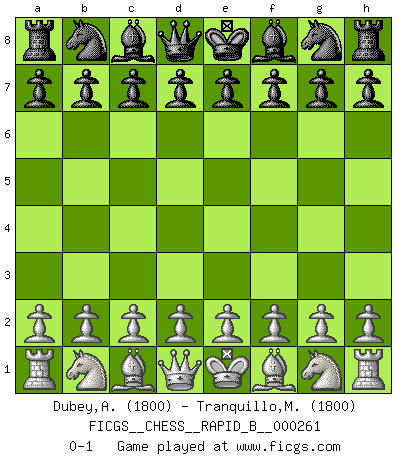 Last move : 0-1 2018 April 19 21:17:0 [Event "FICGS__CHESS__RAPID_B__000261"] [Site "FICGS"] [Date "2018.03.20"] [Round "1"] [White "Dubey,Abhishek"] [Black "Tranquillo,Massimo"] [Result "0-1"] [WhiteElo "1800"] [BlackElo "1800"] 0-1 This chess game has been lost on time (started : 2018.03.20 15:50:20) Player Black won this chess game. Follow this game move after move (download)Chess is a foolish expedient for making idle people believe they are doing something very clever when they are only wasting their time. (George Bernard Shaw) Wer nie einen Fehler gemacht hat, hat nie etwas Neues ausprobiert. (Albert Einstein) En partidas rápidas, el Caballo es mas poderoso que el Alfil. (Vlastimil Hort) Pour moi, les échecs ne sont pas un jeu mais un art. (Alexandre Alekhine) Wisdom begins at the end. (Daniel Webster)