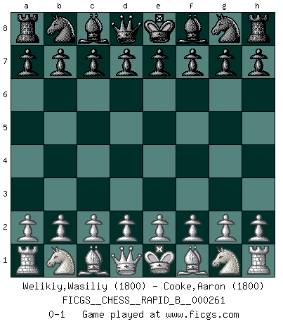Last move : 0-1 2018 April 19 21:17:0 [Event "FICGS__CHESS__RAPID_B__000261"] [Site "FICGS"] [Date "2018.03.20"] [Round "1"] [White "Welikiy,Wasiliy"] [Black "Cooke,Aaron"] [Result "0-1"] [WhiteElo "1800"] [BlackElo "1800"] 0-1 This chess game has been lost on time (started : 2018.03.20 15:50:24) Player Black won this chess game. Follow this game move after move (download)I play correspondence chess because it is both art and science while chess is art only. (A player at FICGS) Ich verstehe mehr vom Schach als irgendein anderer lebender Meister. (José Raúl Capablanca) El Ajedrez lo es todo: arte, ciencia y deporte. (Anatoly Karpov) Si rien de grave n'est détecté lors de l'analyse d'une position, on joue alors le coup. Seconde règle de Blumenfeld. Unless I accept my faults I will most certainly doubt my virtues. (Hugh Prather)
