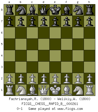 Last move : 0-1 2018 April 19 21:17:0 [Event "FICGS__CHESS__RAPID_B__000261"] [Site "FICGS"] [Date "2018.03.20"] [Round "1"] [White "Fachriansyah,Ryan"] [Black "Welikiy,Wasiliy"] [Result "0-1"] [WhiteElo "1800"] [BlackElo "1800"] 0-1 This chess game has been lost on time (started : 2018.03.20 15:50:24) Player Black won this chess game. Follow this game move after move (download)Daring ideas are like Chess men moved forward. They may be beaten, but they may start a winning game. (Johann Wolfgang von Goethe) Die Auseinandersetzung mit Karpow war politisch geprägt. Er stand für das kommunistische System, wurde von dessen Repräsentanten gehätschelt. Ich war der Oppositionelle. Jeder Schachweltmeister spiegelt auch die gesellschaftlichen Verhältnisse wider. Kramnik steht für die Börsen-Generation des Neuen Markts, ideologiefrei, zahlenfixiert. (Garry Kasparov) Todos los jugadores de Ajedrez deberían tener un pasatiempo. (Savielly Tartakower) Plusieurs personnes se sont demandées comment Tal faisait pour gagner... En fait, c'est très simple ! Il met ses pièces au centre de l'échiquier et les sacrifie quelque part ! (David Bronstein) All politicians must be presumed guilty until they are proven innocent. (Dinesh De Silva)