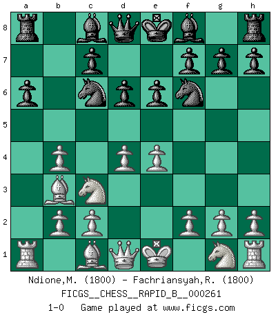 Last move : 1-0 2018 March 29 19:31:59 [Event "FICGS__CHESS__RAPID_B__000261"] [Site "FICGS"] [Date "2018.02.17"] [Round "1"] [White "Ndione,Mamadou"] [Black "Fachriansyah,Ryan"] [Result "1-0"] [WhiteElo "1800"] [BlackElo "1800"] 1.e4 d6 2.d4 Nf6 3.Nc3 Nc6 4.Bb5 a6 5.Ba4 b5 6.Bb3 e6 7.a3 b4 8.axb4 1-0 This chess game has been lost on time (started : 2018.02.17 3:0:58) Pirc defense Player White won this chess game. Follow this game move after move (download)I am still a victim of Chess. It has all the beauty of art and much more. It cannot be commercialized. Chess is much purer than art in its social position. (Marcel Duchamp) Ich verstehe den Grund nicht, warum die Aufteilung in Frauen und Männer überhaupt im Schach besteht. (Judith Polgar) Los asuntos humanos son como una partida de Ajedrez: solo aquellos que no lo toman seriamente, pueden ser llamados buenos jugadores. (Hung Tzu Ch'eng) Si je n'étais pas joueur d'échecs, je serais le meilleur dans quelque chose d'autre. (Anatoli Karpov) All art requires courage. (Anne Tucker)
