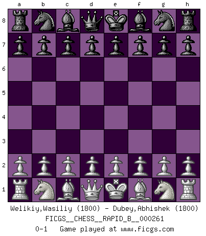 Last move : 0-1 2018 April 19 21:17:0 [Event "FICGS__CHESS__RAPID_B__000261"] [Site "FICGS"] [Date "2018.03.20"] [Round "1"] [White "Welikiy,Wasiliy"] [Black "Dubey,Abhishek"] [Result "0-1"] [WhiteElo "1800"] [BlackElo "1800"] 0-1 This chess game has been lost on time (started : 2018.03.20 15:50:24) Player Black won this chess game. Follow this game move after move (download)Fischer Chess play was always razor-sharp, rational and brilliant. One of the best ever. (Dave Regis) In der Schule lernt man nichts. Es ist nur Zeitverschwendung. (Robert James Fischer) Un mal plan es mejor que no tener ningún plan. (Frank Marshall) J'apprécie les joueurs d'est-indienne, c'est grâce à eux que je nourris ma famille depuis tant d'années. (Petrosian) Always be a first-rate version of yourself, instead of a second-rate version of somebody else. (Judy Garland)