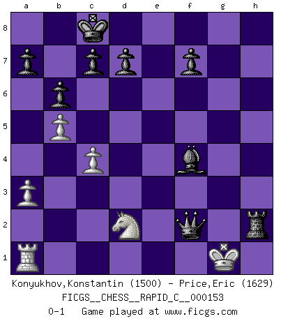 Last move : 0-1 2018 February 27 13:29:18 [Event "FICGS__CHESS__RAPID_C__000153"] [Site "FICGS"] [Date "2018.02.18"] [Round "1"] [White "Konyukhov,Konstantin"] [Black "Price,Eric"] [Result "0-1"] [WhiteElo "1500"] [BlackElo "1629"] 1.e4 e5 2.d4 exd4 3.Qxd4 Nc6 4.Qe3 Nf6 5.c4 Bb4+ 6.Bd2 Qe7 7.a3 Bc5 8.Qc3 Qxe4+ 9.Ne2 Nd4 10.f3 Qe7 11.b4 Nxe2 12.Bxe2 Bd6 13.f4 Ne4 14.Qxg7 Rf8 15.Qxh7 Nxd2 16.Nxd2 b6 17.b5 Bb7 18.Qh5 O-O-O 19.O-O Rh8 20.Qg4 Rdg8 21.Qf3 Bxf3 22.Bxf3 Bxf4 23.Be2 Rxg2+ 24.Kxg2 Qxe2+ 25.Rf2 Rxh2+ 26.Kg1 Qxf2+ 0-1 Centre game : Berger variation Queenside Castling by player Black (move 18) Kingside Castling by player White (move 19) Player Black won this chess game. Follow this game move after move (download)Chess is so inspiring that I do not believe a good player is capable of having an evil thought during the game. (Wilhelm Steinitz) Der zweitbeste Zug ist oft der einzig richtige. (Savielly Grigorievitsch Tartakower) EL Ajedrez es como la vida. (Boris Spassky) Un millionnaire : 'Monsieur Steinitz ! Vous ne participez aux tournois que pour l'argent, alors que moi je n'y viens que pour l'honneur.' Steinitz : 'Chacun joue pour ce qu'il n'a pas'... Is not life a hundred times too short to bore ourselves ? (Friedrich Nietzsche)