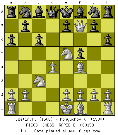 Last move : 1-0 2018 April 2 11:48:14 [Event "FICGS__CHESS__RAPID_C__000153"] [Site "FICGS"] [Date "2018.03.17"] [Round "1"] [White "Costin,Pungaru"] [Black "Konyukhov,Konstantin"] [Result "1-0"] [WhiteElo "1500"] [BlackElo "1500"] 1.d4 d5 2.c4 dxc4 3.Nc3 f5 4.Qa4+ Qd7 5.Qxc4 a6 6.Bf4 c6 7.Nf3 h6 8.Ne5 Qd8 9.Qf7+ 1-0 Queen's gambit accepted Player White won this chess game. Follow this game move after move (download)What would Chess be without silly mistakes ? (Kurt Richter) Ich würde die 30 stärksten Spieler der USA im Simultanspiel besiegen. (José Raúl Capablanca) Existen dos clases de sacrificios: los correctos y los míos. (Mikhail Tal) A ce moment-là, je menaçais de comprendre la position ! (Clément L'Heureux) It's not the size of the dog in the fight, it's the size of the fight in the dog. (Mark Twain)