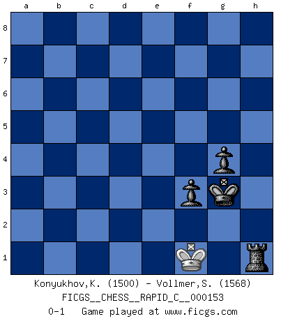 Last move : 0-1 2018 March 30 21:49:6 [Event "FICGS__CHESS__RAPID_C__000153"] [Site "FICGS"] [Date "2018.02.18"] [Round "1"] [White "Konyukhov,Konstantin"] [Black "Vollmer,Steve"] [Result "0-1"] [WhiteElo "1500"] [BlackElo "1568"] 1.e4 c5 2.f4 d6 3.Nf3 Nc6 4.Bb5 Bd7 5.Bxc6 Bxc6 6.Nc3 Nf6 7.d4 Bxe4 8.Nxe4 Nxe4 9.O-O g6 10.dxc5 dxc5 11.Qxd8+ Rxd8 12.Be3 b6 13.Rad1 Rxd1 14.Rxd1 Bg7 15.b3 e6 16.a4 O-O 17.Rd7 a5 18.Rb7 Rd8 19.g4 Nc3 20.Kf2 Nd1+ 21.Ke2 Nxe3 22.Kxe3 Rd6 23.Nd2 Bd4+ 24.Ke2 e5 25.fxe5 Bxe5 26.Nc4 Re6 27.h3 Kg7 28.Kf3 Bc3 29.Nxb6 Rf6+ 30.Ke4 Rf2 31.Nd5 Bb4 32.Nxb4 cxb4 33.Rc7 Rh2 34.c4 Rxh3 35.c5 Rxb3 36.Rb7 Rc3 37.Rb5 b3 38.Rxa5 b2 39.Rb5 Rxc5 40.Rxb2 Rc4+ 41.Kf3 Rxa4 42.Re2 h6 43.Kg3 Ra5 44.Rf2 Rg5 45.Kh3 h5 46.gxh5 Rxh5+ 47.Kg3 f5 48.Rf3 Kf6 49.Rf4 Ke5 50.Kf3 Rh3+ 51.Kg2 Kxf4 52.Kf2 g5 53.Kg2 g4 54.Kf2 Rh2+ 55.Kg1 Kg3 56.Kf1 f4 57.Kg1 f3 58.Kf1 Rh1+ 0-1 Sicilian : Grand Prix attack Kingside Castling by player White (move 9) Kingside Castling by player Black (move 16) 10 pieces endgame at move 39 : White KRPP , Black KRPPPP WHITE : King + 1 Rook 2 Pawns BLACK : King + 1 Rook 4 Pawns 9 pieces endgame at move 40 : White KRPP , Black KRPPP WHITE : King + 1 Rook 2 Pawns BLACK : King + 1 Rook 3 Pawns 8 pieces endgame at move 41 : White KRP , Black KRPPP WHITE : King + 1 Rook 1 Pawn BLACK : King + 1 Rook 3 Pawns 7 pieces endgame at move 46 : White KRP , Black KRPP WHITE : King + 1 Rook 1 Pawn BLACK : King + 1 Rook 2 Pawns 6 pieces endgame at move 46 : White KR , Black KRPP WHITE : King + 1 Rook BLACK : King + 1 Rook 2 Pawns 5 pieces endgame at move 51 : White K , Black KRPP WHITE : King + BLACK : King + 1 Rook 2 Pawns Player Black won this chess game. Follow this game move after move (download)Combinations have always been the most intriguing aspect of Chess. The masters look for them, the public applauds them, the critics praise them. It is because combinations are possible that Chess is more than a lifeless mathematical exercise. They are the poetry of the game; they are to Chess what melody is to music. They represent the triumph of mind over matter. (Reuben Fine) Sie führen leise Selbstgespräche, schlürfen lautstark ihre Getränke, schmatzen hörbar beim Essen, blasen ihrem Gegenüber Rauch in die Augen, niesen ihm ins Gesicht, starren ihn unverwandt an, bis er sich unter ihren Blicken windet, rutschen ständig auf ihrem Stuhl hin und her, rülpsen und bohren in der Nase. (Anonymous) Es muy difícil jugar en contra de la teoría de Einstein. - en su primera derrota en contra de Fischer (Mikhail Tal) Plusieurs personnes se sont demandées comment Tal faisait pour gagner... En fait, c'est très simple ! Il met ses pièces au centre de l'échiquier et les sacrifie quelque part ! (David Bronstein) If we knew what we were doing, we would not call it research. (Albert Einstein)