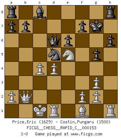 Last move : 1-0 2018 May 27 12:18:27 [Event "FICGS__CHESS__RAPID_C__000153"] [Site "FICGS"] [Date "2018.03.17"] [Round "1"] [White "Price,Eric"] [Black "Costin,Pungaru"] [Result "1-0"] [WhiteElo "1629"] [BlackElo "1500"] 1.d4 Nf6 2.c4 e6 3.Nf3 d5 4.Nc3 Bb4 5.Bg5 Bxc3+ 6.bxc3 O-O 7.e3 h6 8.Bh4 g5 9.Bg3 Ne4 10.Qc2 Nxg3 11.hxg3 Kg7 12.Ne5 Nd7 13.Ng4 Rh8 14.O-O-O Nf6 15.Ne5 Qd6 16.Qb2 c5 17.cxd5 cxd4 18.exd4 Nxd5 19.c4 1-0 This chess game has been lost on time (started : 2018.03.17 4:46:19) Queen's pawn game Kingside Castling by player Black (move 6) Queenside Castling by player White (move 14) Player White won this chess game. Follow this game move after move (download)My style is somewhere between that of Tal and Petrosian. (Reshevsky) Charakterschwächen offenbaren sich normalerweise während einer Schachpartie. (Garry Kasparov) Solo el jugador con la iniciativa tiene el derecho a atacar. (Wilhelm Steinitz) Les ravages du H expliquent la différence de niveau entre Tal et Thal [Abergel]. We're missing something. (Gregory House, House M.D.)