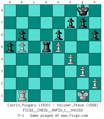 Last move : 0-1 2018 May 22 11:47:49 [Event "FICGS__CHESS__RAPID_C__000153"] [Site "FICGS"] [Date "2018.03.17"] [Round "1"] [White "Costin,Pungaru"] [Black "Vollmer,Steve"] [Result "0-1"] [WhiteElo "1500"] [BlackElo "1568"] 1.d4 d5 2.c4 e6 3.Nc3 Nf6 4.a3 Nbd7 5.b4 a5 6.b5 dxc4 7.e4 Nb6 8.Bg5 Be7 9.a4 O-O 10.Nf3 Bd7 11.Rb1 c6 12.bxc6 Bxc6 13.e5 Nfd5 14.Bxe7 Nxe7 15.Be2 Qc7 16.O-O Rac8 17.Qc2 h6 18.Nb5 Bxb5 19.Rxb5 Nbd5 20.Rc5 Qd7 21.Qxc4 b6 22.Rxc8 Rxc8 23.Qb5 Qxb5 24.Bxb5 Nc3 25.Nd2 Nxb5 26.axb5 Rd8 27.Nf3 Rd5 28.Rb1 Nf5 29.g3 Nxd4 30.Nxd4 Rxd4 31.f4 Rd5 0-1 This chess game has been lost on time (started : 2018.03.17 4:46:19) QGD : 3...Nf6 Kingside Castling by player Black (move 9) Kingside Castling by player White (move 16) Player Black won this chess game. Follow this game move after move (download)That's what Chess is all about. One day you give your opponent a lesson, the next day he gives you one. (Bobby Fischer) Der Traum, für den ich lebe, ist der von einem freien Russland. Viele mögen sagen: Russland hat doch ein Parlament, einen gewählten Präsidenten. Aber ich spüre, dass in meiner Heimat die Angst wiederkehrt. Eine Angst, sich frei zu äußern, bestimmte Dinge zu tun (Garry Kasparov) Todos los jugadores de Ajedrez deberían tener un pasatiempo. (Savielly Tartakower) Les Echecs sont et restent toujours un combat, un combat intégral comme la boxe, la lutte ou un autre sport, et où il doit y avoir un vainqueur et un vaincu. (Joseph Emil Diemer) Think like a man of action, act like a man of thought. (Henri Louis Bergson)
