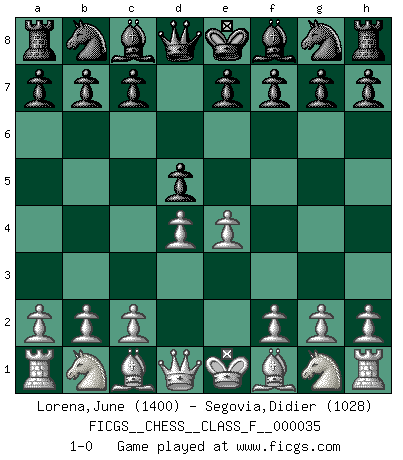 Last move : 1-0 2007 June 15 19:39:34 [Event "FICGS__CHESS__CLASS_F__000035"] [Site "FICGS"] [Date "2007.04.24"] [Round "1"] [White "Lorena,June"] [Black "Segovia,Didier"] [Result "1-0"] [WhiteElo "1400"] [BlackElo "1028"] 1.d4 d5 2.e4 1-0 This chess game has been lost on time (started : 2007.04.24 1:55:45) Blackmar gambit Player White won this chess game. Follow this game move after move (download)The battle for the ultimate truth will never be won. And that's why Chess is so fascinating. (Hans Kmoch) Ich spiele 70 Eröffnungssysteme. (Viktor Kortschnoi) ¿Esta Bobby Fischer algo cuerdo?. (Salo Flohr) Botvinnik disait en comparant les échecs à la musique: Il existe une science dont le but est l'étude de l'acoustique et des sons. Mais il y a aussi un art qui se sert de l'océan des sons : c'est la musique. De toute évidence, il en est de même pour la pensée. La logique est l'étude des lois de la réflexion et les échecs reflètent, en tant qu'art, le côté logique de la réflexion, sous la forme d'images artistiques... Extrait de Fischer - Spassky, Reykjavik 1972 par Alexander & F. Wyndham (Ed. Solar), p 37. Quotation,n.: The act of repeating erroneously the words of another. The words erroneously repeated. (Ambrose Bierce, The Devil's Dictionary)