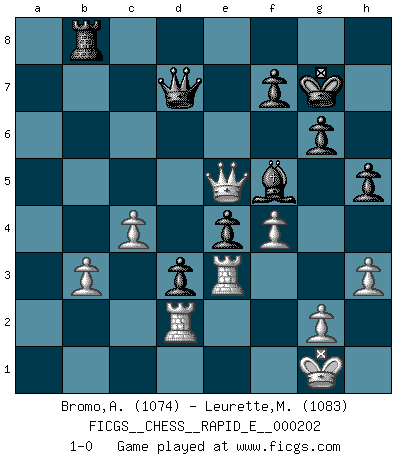 Last move : 1-0 2018 February 23 21:9:19 [Event "FICGS__CHESS__RAPID_E__000202"] [Site "FICGS"] [Date "2018.02.20"] [Round "1"] [White "Bromo,Alexis"] [Black "Leurette,Marc-Antoine"] [Result "1-0"] [WhiteElo "1074"] [BlackElo "1083"] 1.e4 e5 2.Nf3 Nc6 3.a3 Nf6 4.Nc3 Be7 5.h3 d6 6.Bb5 Bd7 7.d3 O-O 8.O-O a6 9.Ba4 b5 10.Bb3 Na5 11.Ba2 c5 12.Bd2 b4 13.axb4 cxb4 14.Nd5 Nxd5 15.Bxd5 Rb8 16.b3 Re8 17.Re1 Bf6 18.Bg5 Nc6 19.Bxf6 Qxf6 20.Rxa6 Ne7 21.Ra1 Nxd5 22.exd5 h6 23.d4 e4 24.Nd2 Bf5 25.Re3 Qxd4 26.Qe1 Rbc8 27.Ra2 Qxd5 28.Nc4 Qc6 29.Qxb4 d5 30.Nd6 Qd7 31.Nxe8 Rxe8 32.c4 d4 33.Rg3 g6 34.Qc5 d3 35.Rd2 h5 36.f4 Kg7 37.Re3 Rb8 38.Qe5+ 1-0 King's pawn game Kingside Castling by player Black (move 7) Kingside Castling by player White (move 8) Player White won this chess game. Follow this game move after move (download)Do you realize Fischer almost never has any bad pieces? He exchanges them, and the bad pieces remain with his opponents. (Yuri Balashov) Die Elozahlen sind sehr schlecht für das Schach. Jetzt ist Schach eine Sportindustrie, die darauf zielt Elopunkte zu machen. (Miguel Najdorf) El Ajedrez es el juego mas altamente simbólico, pero las agresiones estan por lo tanto aún mas francamente representadas en la partida. Tal vez comenzo como un juego de guerra; Algo como la representación de una batalla en miniatura entre las fuerzas de dos reinos. (Karl Meninger) Vous savez, camarade Pachman, je n'éprouve pas de plaisir à être ministre, je jouerais plutôt aux échecs comme vous, ou alors ferais une révolution au Venezuela. (Che Guevara à Ludek Pachman, 'Checkmate in Prague', 1975) That's absurd. I love it. (Gregory House, House M.D.)
