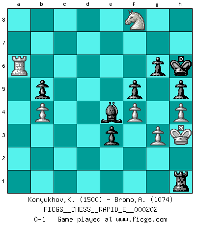 Last move : 0-1 2018 February 28 20:19:11 [Event "FICGS__CHESS__RAPID_E__000202"] [Site "FICGS"] [Date "2018.02.20"] [Round "1"] [White "Konyukhov,Konstantin"] [Black "Bromo,Alexis"] [Result "0-1"] [WhiteElo "1500"] [BlackElo "1074"] 1.e4 e5 2.d4 d6 3.dxe5 dxe5 4.Qxd8+ Kxd8 5.Bb5 c6 6.Ba4 Nf6 7.Bg5 Be7 8.Nf3 Nbd7 9.O-O Nxe4 10.Bxe7+ Kxe7 11.b4 b5 12.Bb3 Rd8 13.Rd1 f6 14.a4 Bb7 15.axb5 cxb5 16.Nbd2 Nc3 17.Re1 a6 18.Re3 Nd5 19.Bxd5 Bxd5 20.Nh4 g6 21.g3 f5 22.f4 e4 23.Ng2 Kf6 24.h4 h5 25.c3 Nb6 26.Ne1 Nc4 27.Nxc4 Bxc4 28.Nc2 Rd3 29.Rxd3 Bxd3 30.Nd4 Rc8 31.Nb3 Rxc3 32.Rxa6+ Kg7 33.Nd4 e3 34.Ne6+ Kh6 35.Nf8 Rc1+ 36.Kg2 Be4+ 37.Kh3 Rh1+ 0-1 King's pawn game Kingside Castling by player White (move 9) Player Black won this chess game. Follow this game move after move (download)Without error there can be no brilliancy. (Emanuel Lasker) Ohne Fehler kann es keine Brillanz geben. (Emanuel Lasker) Después de una mala apertura, hay una esperanza en el juego medio. Pero una vez que estas en finales, el momento de la verdad ha llegado. (Edmar Mednis) Des combinaisons [dans le jeu d'échecs] pareilles à des mélodies. Je crois entendre pour ainsi dire la musique des coups... (Vladimir Nabokov) Always be a first-rate version of yourself, instead of a second-rate version of somebody else. (Judy Garland)