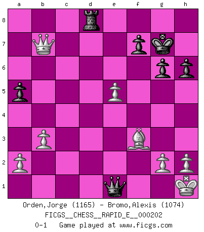 Last move : 0-1 2018 March 12 18:32:3 [Event "FICGS__CHESS__RAPID_E__000202"] [Site "FICGS"] [Date "2018.02.20"] [Round "1"] [White "Orden,Jorge"] [Black "Bromo,Alexis"] [Result "0-1"] [WhiteElo "1165"] [BlackElo "1074"] 1.d4 d5 2.Nf3 Nc6 3.e3 a6 4.Be2 h6 5.O-O Nf6 6.b3 Bf5 7.Bb2 e6 8.c4 Bb4 9.Bc3 Bxb1 10.Bxb4 a5 11.Bf8 Kxf8 12.Rxb1 Ne4 13.Ne5 Nxe5 14.dxe5 Nc3 15.Qc2 Nxb1 16.Rxb1 Qg5 17.cxd5 exd5 18.Qxc7 g6 19.Qxb7 Kg7 20.Rc1 Rhd8 21.Bf3 d4 22.Rd1 dxe3 23.Rxd8 Rxd8 24.fxe3 Qxe3+ 25.Kh1 Qe1+ 0-1 Queen's pawn game, Chigorin variation Kingside Castling by player White (move 5) Player Black won this chess game. Follow this game move after move (download)Fischer sacrificed virtually everything most of us weakies (to use his term) value, respect, and cherish, for the sake of an artful, often beautiful board game, for the ambivalent privilege of being its greatest master. (Paul Kollar) Es ist im Leben wie im Schachspiel. Wir entwerfen einen Plan, dieser bleibt jedoch bedingt durch das, was im Schachspiel dem Gegner, im Leben dem Schicksal zu tun belieben wird. (Arthur Schopenhauer) Tu sabes, camarada Pachman, no disfruto el ser un Ministro, preferería jugar al Ajedrez como tu. (Che Guevara) Avec des compensations pour le matériel en plus... (Anonyme) Ah, beer! The cause of, and the solution to, all of life's problems. (Homer Simpson)