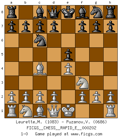Last move : 1-0 2018 March 25 11:53:14 [Event "FICGS__CHESS__RAPID_E__000202"] [Site "FICGS"] [Date "2018.02.20"] [Round "1"] [White "Leurette,Marc-Antoine"] [Black "Puzanov,Vasyl"] [Result "1-0"] [WhiteElo "1083"] [BlackElo "0686"] 1.e4 e5 2.Nf3 Nc6 3.Bc4 1-0 King's pawn game Player White won this chess game. Follow this game move after move (download)Strategy requires thought, tactics require observation. (Max Euwe) Irgendwie scheint mir sonntags früh um 9 Uhr der Killerinstinkt verloren gegangen zu sein. (Alexej Shirov) Prefiero perder una partida realmente buena, que ganar una mala. (David Levy) Le jeu d'échecs est comme rejeté hors du temps. (Antoine de Saint-Exupéry) Dave, my mind is going. I can feel it. (HAL 9000 in 2001, a space odyssey)