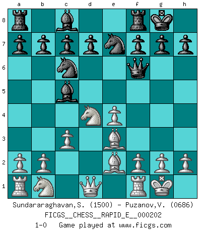 Last move : 1-0 2018 March 31 7:46:26 [Event "FICGS__CHESS__RAPID_E__000202"] [Site "FICGS"] [Date "2018.02.20"] [Round "1"] [White "Sundararaghavan,Shailesh"] [Black "Puzanov,Vasyl"] [Result "1-0"] [WhiteElo "1500"] [BlackElo "0686"] 1.e4 e5 2.Nf3 Nc6 3.d4 exd4 4.Nxd4 Bc5 5.Be3 Qf6 6.c3 Nge7 7.Be2 O-O 8.O-O 1-0 This chess game has been lost on time (started : 2018.02.20 21:28:4) Scotch game Kingside Castling by player Black (move 7) Kingside Castling by player White (move 8) Player White won this chess game. Follow this game move after move (download)I won't play with you anymore. You have insulted my friend. - When an opponent cursed himself for a blunder. (Miguel Najdorf) Ja, ich habe einmal eine Blitzpartie gespielt, es war in einem Zug, 1929. --im Interview 1989 (Mikhail Moiseyevich Botvinik) El Ajedrez moderno está demasiado preocupado con cosas como la estructura de Peones. Olvidenlo, el Jaque Mate termina la partida. (Nigel Short) Même si vous avez un bon coup à faire, regardez toujours s'il n'y en a pas un qui lui soit préférable. (Pedro Damiano) 98% of all statistics are made up. (Author unknown)