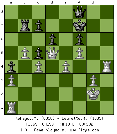 Last move : 1-0 2018 February 22 21:39:34 [Event "FICGS__CHESS__RAPID_E__000202"] [Site "FICGS"] [Date "2018.02.20"] [Round "1"] [White "Kehayov,Yulian"] [Black "Leurette,Marc-Antoine"] [Result "1-0"] [WhiteElo "0850"] [BlackElo "1083"] 1.e4 e5 2.Nf3 Nc6 3.d4 exd4 4.Nxd4 Nf6 5.Nxc6 bxc6 6.Nc3 Bb4 7.Bd2 O-O 8.a3 Bxc3 9.Bxc3 Re8 10.f3 d6 11.Be2 a5 12.O-O a4 13.Bxf6 Qxf6 14.c3 Ba6 15.Bxa6 Rxa6 16.Qd2 c5 17.Qd3 Qe6 18.Qxa6 g6 19.Qb5 Ra8 20.Qc6 Qc8 21.Rfb1 Ra6 22.Qd5 Kg7 23.b3 h5 24.b4 Rc6 25.b5 Rb6 26.c4 f6 27.Re1 g5 28.g3 Kg6 29.Kg2 Rb8 30.f4 Qf8 31.f5+ Kg7 32.h3 g4 33.hxg4 hxg4 34.Qd1 Qf7 35.Qxg4+ Kf8 36.Qe2 Kg7 37.Qd3 Qf8 38.Rh1 Rb7 39.Rh4 Kf7 40.Qd5+ 1-0 Scotch : Schmidt variation Kingside Castling by player Black (move 7) Kingside Castling by player White (move 12) Player White won this chess game. Follow this game move after move (download)First-class players lose to second class players because second-class players sometimes play a first-class game. (Tarrasch) Ich bin Weltmeister und muß mit niemandem irgend etwas diskutieren. (Viswanathan Anand) Por la belleza de sus partidas, la claridad de su juego y lo brillante de sus ideas, Fischer se creó el mismo como un artista de la misma estatura como Brahms, Rembrandt y Shakespeare. (David Levy) RxDa4 pat (...) Wisdom doesn't necessarily come with age. Sometimes age just shows up all by itself. (Tom Wilson)