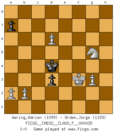 Last move : 1-0 2007 May 18 19:22:29 [Event "FICGS__CHESS__CLASS_F__000035"] [Site "FICGS"] [Date "2007.04.24"] [Round "1"] [White "Gering,Adrien"] [Black "Orden,Jorge"] [Result "1-0"] [WhiteElo "1099"] [BlackElo "1193"] 1.e4 c5 2.f4 g6 3.Nc3 Bg7 4.Nf3 Nc6 5.Bc4 d6 6.Bb5 Bg4 7.Bxc6+ bxc6 8.d3 e5 9.O-O exf4 10.Bxf4 Ne7 11.Qe1 O-O 12.Qh4 Bxf3 13.Rxf3 f5 14.Rh3 h5 15.Bg5 Rf7 16.exf5 Nxf5 17.Bxd8 Nxh4 18.Bxh4 Raf8 19.Rf3 Rxf3 20.gxf3 Rxf3 21.Kg2 Rf5 22.Rf1 Rxf1 23.Kxf1 Kf7 24.Ke2 Ke6 25.Kf3 Be5 26.Bg3 Bd4 27.Nd1 g5 28.c3 h4 29.cxd4 hxg3 30.hxg3 cxd4 31.Kg4 Kf6 32.Nf2 d5 33.Nh3 c5 34.Nxg5 c4 35.dxc4 d3 36.cxd5 Ke5 37.Kf3 Kd4 38.d6 1-0 Sicilian : Grand Prix attack Kingside Castling by player White (move 9) Kingside Castling by player Black (move 11) 10 pieces endgame at move 35 : White KNPPPP , Black KPPP WHITE : King + 1 Knight 4 Pawns BLACK : King + 3 Pawns 9 pieces endgame at move 36 : White KNPPPP , Black KPP WHITE : King + 1 Knight 4 Pawns BLACK : King + 2 Pawns Player White won this chess game. Follow this game move after move (download)After black's reply to 1.e4 with 1..e5, leaves him always trying to get into the game. (Howard Staunton) Kann Schach nicht schließlich das Nationalspiel der Deutschen werden? Und welche weiteren Ausblicke bieten sich dann dar! Welche Hebung des allgemeinen Kultur-Niveaus, ja der Moral, wenn das Schachbrett den Kartentisch verdrängen würde! Wahrlich, ein Ziel, des Schweißes der Edlen wert! (Siegbert Tarrasch) Los Peones son nacidos libres, y aún así, se encuentran encadenados por todos lados. (Rick Kennedy) A chaque perte on perd un peu de soi. (Joël Lautier) After growing wildly for years, the field of computing appears to be reaching its infancy. (John Pierce)