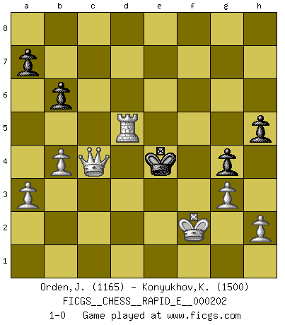 Last move : 1-0 2018 April 19 15:41:23 [Event "FICGS__CHESS__RAPID_E__000202"] [Site "FICGS"] [Date "2018.02.20"] [Round "1"] [White "Orden,Jorge"] [Black "Konyukhov,Konstantin"] [Result "1-0"] [WhiteElo "1165"] [BlackElo "1500"] 1.d4 d5 2.Nf3 b6 3.e3 Bg4 4.Be2 Bxf3 5.Bxf3 e6 6.O-O Nc6 7.c4 Nb4 8.a3 Nc6 9.Qb3 Nge7 10.Nc3 f5 11.cxd5 exd5 12.Nxd5 Qd7 13.Nxe7 Bxe7 14.Qc4 Na5 15.Qc3 Rd8 16.b4 Nc6 17.Bxc6 O-O 18.Bxd7 Rxd7 19.Bb2 g5 20.d5 Bf6 21.Qc6 Rdf7 22.Bxf6 Rxf6 23.Qxc7 g4 24.d6 R6f7 25.d7 Rxd7 26.Qxd7 h5 27.Rac1 f4 28.Rc8 Rxc8 29.Qxc8+ Kf7 30.Rd1 fxe3 31.Rd7+ Kg6 32.Qc6+ Kg5 33.g3 exf2+ 34.Kxf2 Kf5 35.Rd5+ Ke4 36.Qc4+ 1-0 Queen's pawn game Kingside Castling by player White (move 6) Kingside Castling by player Black (move 17) Player White won this chess game. Follow this game move after move (download)Chess, like love, like music, has the power to make people happy. (Siegbert Tarrasch) Ein Springer auf f6 gegen die eigene Rochadestellung ist schlimmer als ein rostiger Nagel im Knie. (Efim Bogoljubov) El Ajedrez es una guerra en un tablero. El objetivo es aplastar la mente del oponente. (Bobby Fischer) On entre au jeu d'Echecs comme on entre en Religion. Pour le joueur d'Echecs, la partie d'Echecs c'est l'office, la messe, le défilé du 1er Mai, le dépôt de gerbe au Monument aux Morts. C'est un drame sacré. (Michel Roos) If computers get too powerful, we can organize them into committees. That'll do them in. (Anonymous)
