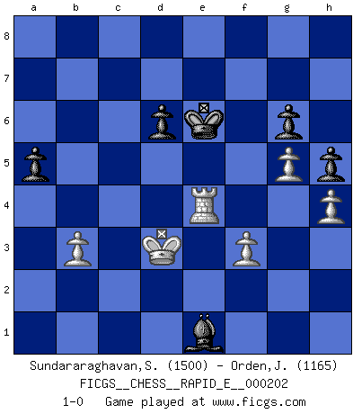 Last move : 1-0 2018 April 22 23:5:53 [Event "FICGS__CHESS__RAPID_E__000202"] [Site "FICGS"] [Date "2018.02.20"] [Round "1"] [White "Sundararaghavan,Shailesh"] [Black "Orden,Jorge"] [Result "1-0"] [WhiteElo "1500"] [BlackElo "1165"] 1.e4 c5 2.Nf3 d6 3.d4 cxd4 4.Nxd4 Nf6 5.Nc3 a6 6.Be2 Nc6 7.Be3 e6 8.O-O Nxd4 9.Bxd4 Be7 10.Bf3 O-O 11.h3 Qc7 12.Re1 e5 13.Be3 Be6 14.Nd5 Nxd5 15.exd5 Bf5 16.c3 e4 17.Bg4 Bxg4 18.Qxg4 Rfe8 19.Qxe4 Bf6 20.Qf3 Qc4 21.a3 b5 22.Rad1 Re4 23.Bd4 Rxd4 24.cxd4 Bxd4 25.b3 Qc3 26.Qxc3 Bxc3 27.Re3 b4 28.axb4 Bxb4 29.Ra1 a5 30.Re4 Rc8 31.Ra2 g6 32.Rc4 Re8 33.Rac2 Re5 34.Rd4 Bc5 35.Rd3 f5 36.g3 Re1+ 37.Kg2 Kg7 38.h4 Kf6 39.Kf3 Re4 40.Rc1 Ke5 41.Rc2 Rd4 42.Rxd4 Kxd4 43.Ke2 Kxd5 44.Kd3 Ke5 45.f3 Kd5 46.Re2 h6 47.g4 f4 48.g5 h5 49.Re4 Be3 50.Ra4 Bf2 51.Rxf4 Ke6 52.Ra4 Be1 53.Re4+ 1-0 Sicilian : Najdorf, Opovcensky variation Kingside Castling by player White (move 8) Kingside Castling by player Black (move 10) Player White won this chess game. Follow this game move after move (download)One of these modest little moves may be more embarrassing to your opponent than the biggest threat. (Siegbert Tarrasch) Modernes Schach erfordert enorme Anspannung. Es ist für einen normalen Menschen unmöglich das auszuhalten. (Viktor Kortschnoi) Con el tiempo, empecé a progresar en partidas decisivas. Tal vez porque me di cuenta de una simple verdad: no solo estaba yo nervioso sino también mi oponente. (Mikhail Tal) Toute estimation doit être constamment réévaluée. (Jacob Estrin) Somehow our devils are never quite what we expect when we meet them face to face. (Nelson DeMille)