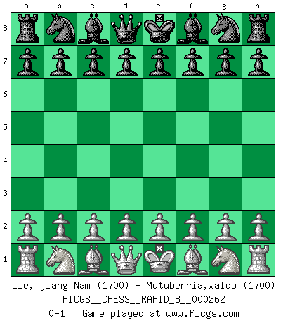 Last move : 0-1 2018 April 20 21:20:32 [Event "FICGS__CHESS__RAPID_B__000262"] [Site "FICGS"] [Date "2018.03.21"] [Round "1"] [White "Lie,Tjiang Nam"] [Black "Mutuberria,Waldo"] [Result "0-1"] [WhiteElo "1700"] [BlackElo "1700"] 0-1 This chess game has been lost on time (started : 2018.03.21 15:38:33) Player Black won this chess game. Follow this game move after move (download)There is no remorse like the remorse of Chess. (H. G. Wells) Wir können eben der zündenden Macht des Opfers nicht wiederstehen, denn die Begeisterung für das Opfer liegt in der Natur des Menschen. (Rudolf Spielmann) A la fecha, Fischer esta simplemente un nivel arriba de todos los mejores jugadores de Ajedrez del mundo. (John Jacobs) Je crois qu'il existe des manières très spécifiques de jouer efficacement contre une machine. Evidemment, nous n'avons aucune chance en technique pure, parce que l'ordinateur calcule de manière parfaite. Mais lorsque nous faisons appel à notre cerveau, en utilisant l'intuition et la compréhension, alors nous restons beaucoup plus forts. (Anatoli Karpov) For peace of mind, resign as general manager of the universe. (Douglas Adams)