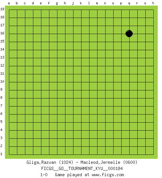 Last move : 1-0 2018 March 25 19:15:50 [Event "FICGS__GO__TOURNAMENT_KYU__000184"] [Site "FICGS"] [Date "2018.02.21"] [Round "1"] [Black "Gliga,Razvan"] [White "Macleod,Jermelle"] [Result "1-0"] [Rating 1 "1024"] [Rating 2 "0600"] 1.q16 1-0 This go game has been lost on time (started : 2018.02.21 22:46:58) Here are the names of the openings (joseki) played in the four corners : Player Black won this Go (weiqi, baduk) game. Follow this game move after move (download)Do not fear furikawari. (Anonymous) The arrogant army will lose certainly the battle. (Chinese proverb)