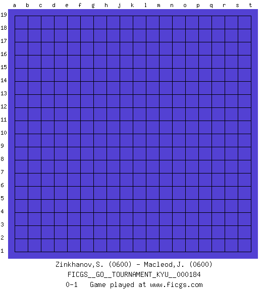 Last move : 0-1 2018 March 24 6:12:19 [Event "FICGS__GO__TOURNAMENT_KYU__000184"] [Site "FICGS"] [Date "2018.02.21"] [Round "1"] [Black "Zinkhanov,Sungat"] [White "Macleod,Jermelle"] [Result "0-1"] [Rating 1 "0600"] [Rating 2 "0600"] 0-1 This go game has been lost on time (started : 2018.02.21 22:46:58) Here are the names of the openings (joseki) played in the four corners : Player White won this Go (weiqi, baduk) game. Follow this game move after move (download)Territory is a closed space where time no longer exists. The transformation around it slower alter it, and sometimes it cracks open like a rotten egg at the least shock. (Pierre Audouard) A belief is an idea the mind possesses, an idea that possesses the mind. (Robert Oxden Bolton)